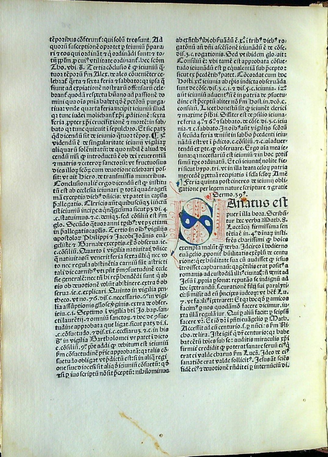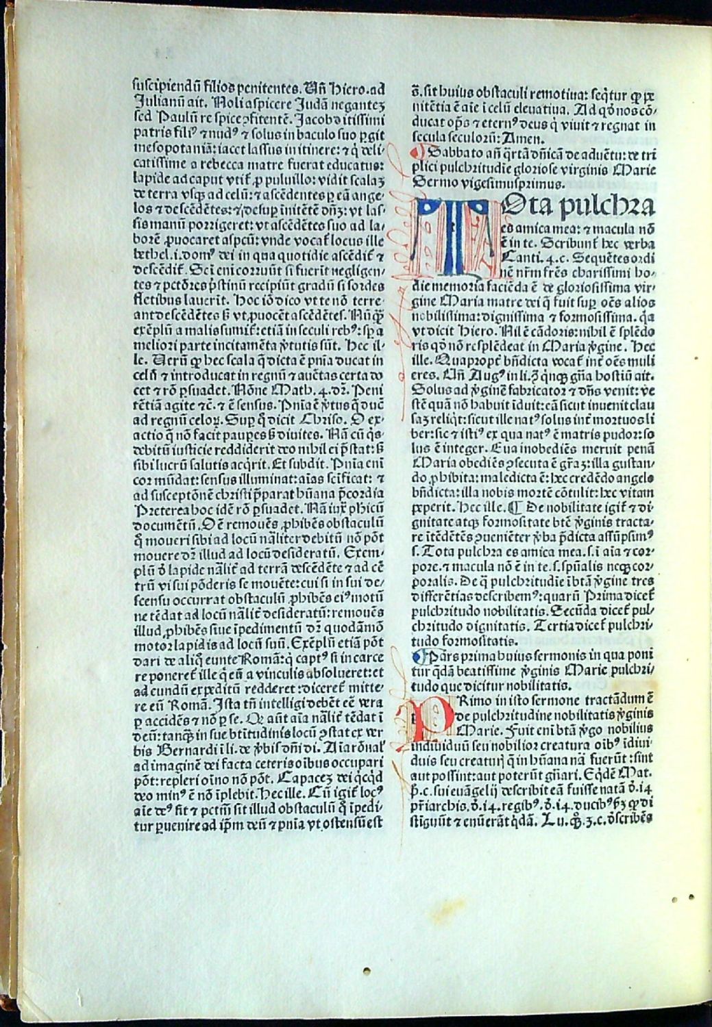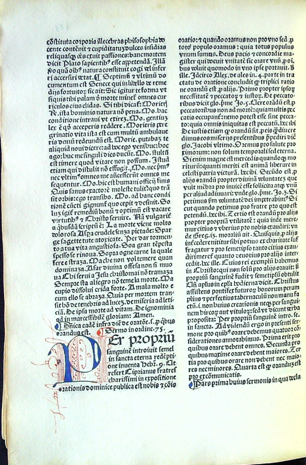 ISTC ic00196000; HC 4506; Goff C196, GW 6131; BMC V,336<br>Tištěno rotundou v 50 řádcích, dvousloupcový tisk, arabská paginace listů při horním vnějším okraji (2 listy nepaginované pak paginace 1-221), signatury (a-y A-F8). Na foliu a3 vícebarevná malovaná iniciála olemovaná zlaceným rámem ve výši 16 řádků, při jejím vnitřním okraji zčásti zlacená rostlinná drolerie, stejná drolerie při horním okraji, sloupce oddělené malovanou, zčásti zlacenou tyčí, při spodním okraji malovaná kartuše, zčásti zlacená rostlinného dekoru. V textu řada kreslených modrých a červených iniciál ve výši 3-7 řádků na červeném podkladu s různě dlouhými lehce načrtnutými prostorovými rozvilinami, červené rubriky.<br>Vazba z tmavě hnědé hověziny z 18. století, ve hřbetu 5 vazů, ve druhém poli tlačené zkratka "PHILO", v ostatních polích tlačený ornament, desky vazby se lehce rozvírají, kůže vazby místy odřená a při spodním okraji hřbetu v délce cca 2 cm kůže ve hřbetu proděravělá. V textu místy staré rkp. marginálie, na foliu l8 (listu č. 86) při spodním okraji odstřižen kus nepotištěného papíru, list č. 215 při spodním okraji mírně roztřepený, na konci pod kolofónem světle černá skvrna od inkoustu. Chybí poslední nepotištěný list. Knižní blok místy lehce uvolněný. Přes popsané závady však ve stavu velmi dobrém.<br>Michael de Carcano či Michael de Carcanis de Mediolano (1427 - 1484), byl italský františkánský kazatel narozený v milánské šlechtické rodině. Roku 1442 vstoupil do řádu Františkánů a stal se potulným kazatelem. Patřil též k zakladatelům charitativní úvěrové instituce "Montes Pietatius". Ve svých kázáních často brojil proti lichvě, kterou spojoval výhradně se Židy (již v jeho době si řada křesťanských lichvářů účtovala mnohem vyšší úrok než židovští věřitelé). Jeho antisemitské projevy výrazně podpořily pronásledování Židů v Itálii. Nabízená kniha je prvním knižním vydáním jeho kázání.<br>Nicolaus von Frankfurt byl významný tiskař původem z Německa, který působil v letech 1473-1516 (v letech 1473 až 1477 spolupracoval s Franz Rennerem a na vydání knih se podílel spíše finančně) v Benátkách a vytiskl nejméně 105 knih.