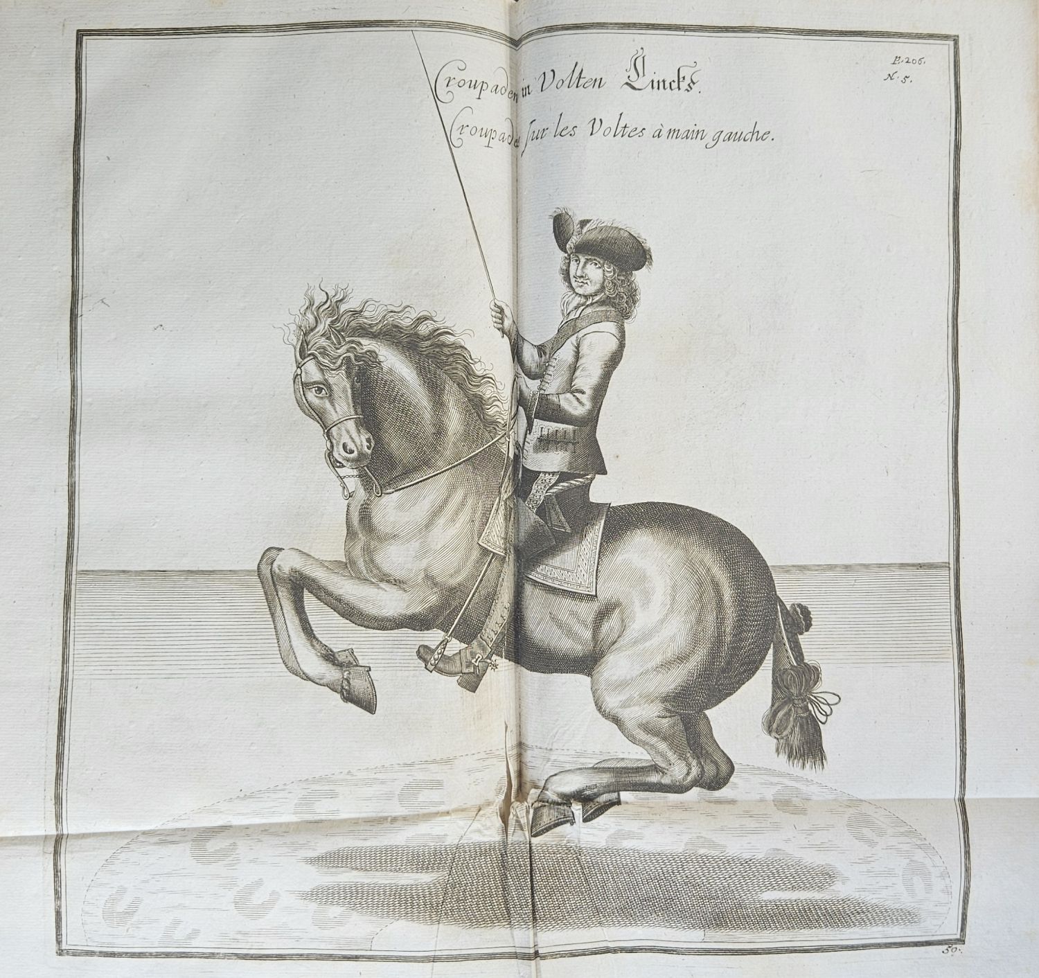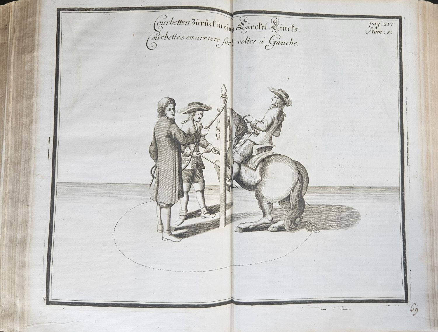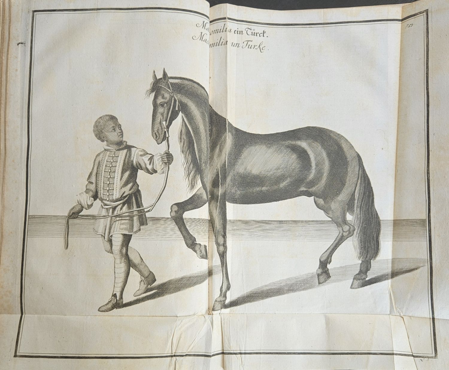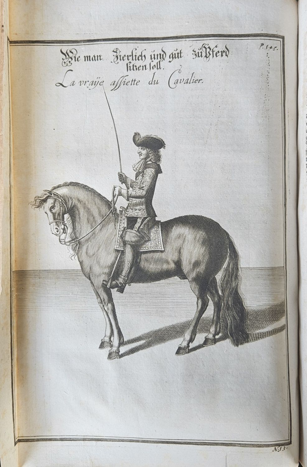 Lipperheide Tc31; Graesse II,93; Nissen ZBI 852.<br>Předtitul, dva titulní listy (prvý německý červeno-černě tištěný), druhý francouzský. Tištěno ve dvou sloupcích (v levém německý text, v pravém francouzský), živá záhlaví od sazby oddělená jednoduchou linkou. Na rubu francouzského tit. listu celostr. mědirytina s vyobrazením erbu hrabat Šliků, v úvodu tištěná dedikace hraběti Františkovi Josefovi Šlikovi. Dřevořezové viněty, pásové vlysy z ornamentů, květin, ilustrací, konturové iniciály zalomené do výše 4-7 řádků, tučně tištěné iniciály ve výši 2 řádků, jednoduché mizící linky. Kniha se skládá ze 4 částí průběžně paginovaných.<br>Dobová pergamenová vazba, na předním přídeští u spodního okraje pap. štítěk z počátku 20. století "Günther Leisten Antiquar Köln". Vazba místy zašpiněná a odřená, naražené rohy, papír místy zahnědlý, tři rytiny při spodním okraji lehce natržené a několik mírně pomačkaných.<br>William Cavendish, 1. vévoda z Newcastlu (1593 - 25.12. 1676) anglický dvořan a podporovatel umění, proslul jako chovatel koní a mecenáš dramatika Bena Johnsona, podporoval též Hobbese, Descarta a Gassendiho. Roku 1648 emigroval do Rotterdamu a poté do Antverp, kde založil slavnou jízdárnu. Roku 1660 se vrátil do Anglie a podařilo se mu získat zpět část svých konfiskovaných statků. Namísto politiky se pak po zbytek života věnoval koním. Roku 1658 publikoval svoji první práci o jezdectví a roku 1667 druhou, námi nabízenou.