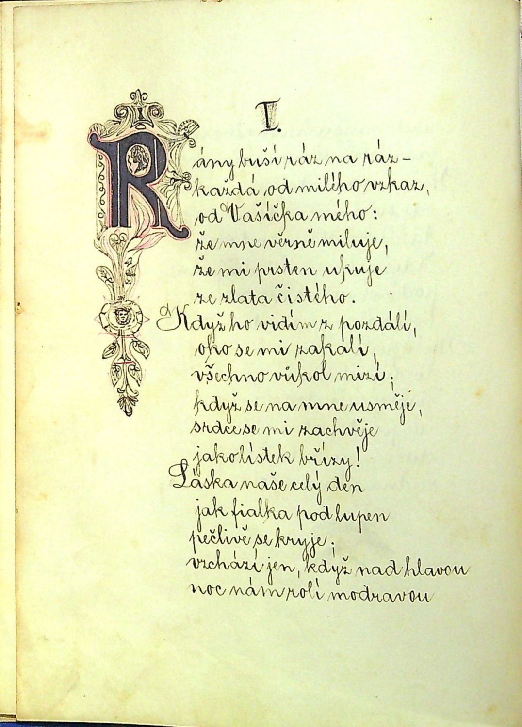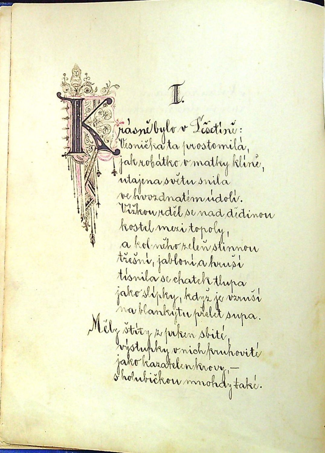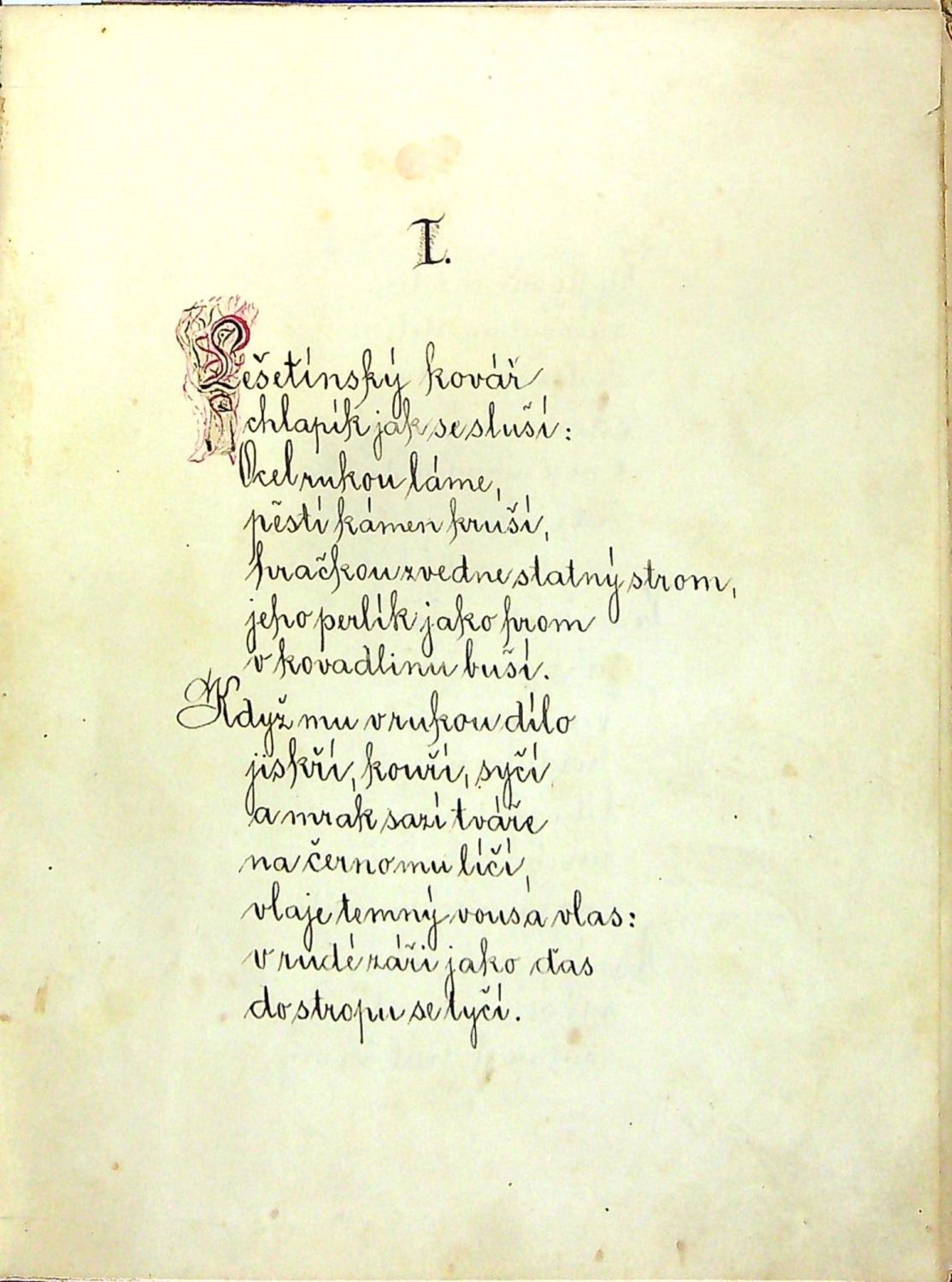 Kaligraficky psaný rukopis, římsky číslované jednotlivé sloky, plné iniciálky, iniciálky zasazené v čárových dvoubarevných kompozicích, tučně malované plné iniciály ve výši 3-4 řádek zasazené v rostlinné, ornamentální či ilustrativní kompozici, malované viněty rostlinné, ornamentální, ilustrativní.<br>Plátěná vazba z 80. let 19. století od knihaře Jana Floriána Šaška. Na přední desce tlačený a zlacený rám z ornamentů, uvnitř rámu tlačené zrcadlo zdobené v rozích ornamentem, uvnitř zrcadla tlačený a zlacený název, na desce zadní při spodním okraji tlačené jméno knihařovo. Vazba ohmataná a místy odřená, ve hřbetu místy potrhaná, na rubu přední předsádky jméno jednoho z předchozích majitelů "Ignát Vavera". <br>Pravděpodobně opis prvního vydání z roku 1883, které bylo konfiskováno. II. vydání vyšlo roku 1892 v USA. - Jan Florián Šašek (1836 Žďár nad Sázavou - 11.10. 1889 Velké Meziříčí) od roku 1869 žil ve Velkém Meziříčí, kde nejprve založil knihkupectví, později knihtiskárnu, knihvazačství a nakladatelství. Krom jiného vydával i první učitelský časopis "Národ a škola", později i měsíčník "Vesna". Byl zakládajícím členem učitelské jednoty "Budeč".
