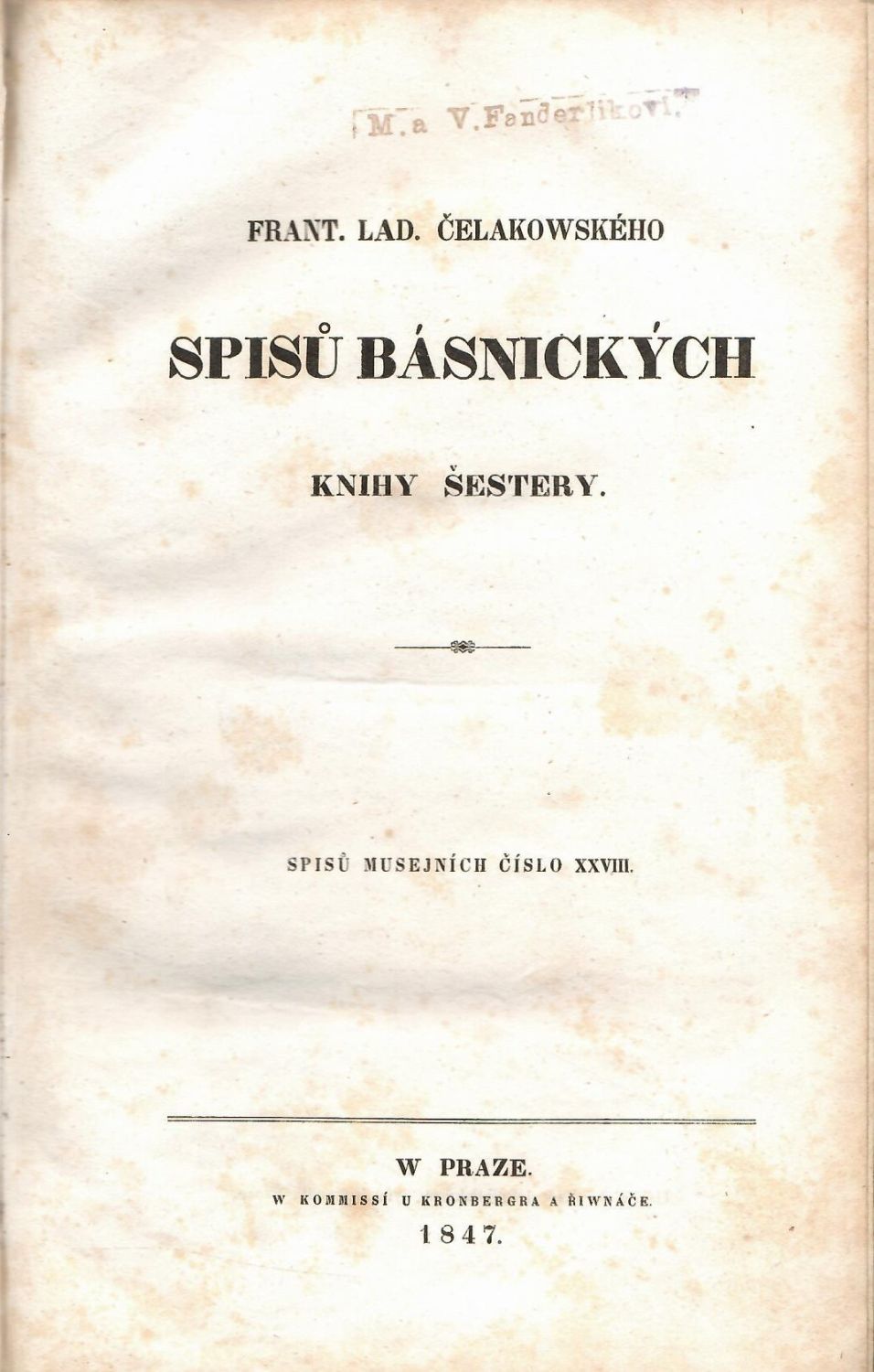 Dobová, strojově lisovaná "lipská" vazba, ve hřbetu poškozená - potrhaná s chybějícími kousky plátna, naražené rohy, na tit. straně hnědé skvrny, text samotný ve stavu velmi dobrém.