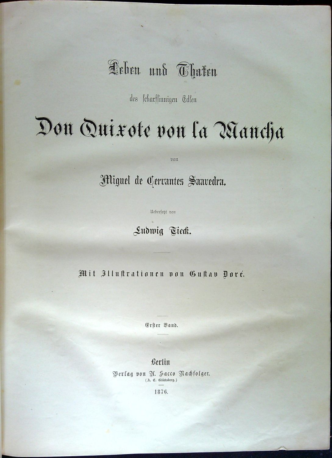 Leben und Thaten des scharfsinnigen Edlen Don Quixote von La Mancha ... Uebersetzt von Ludwig Tieck. Mit Illustrationen von Gustav Doré. Erster + zweiter Band.