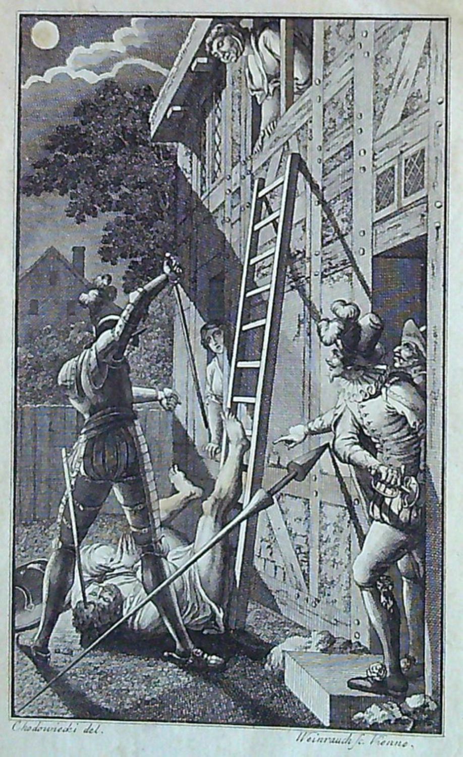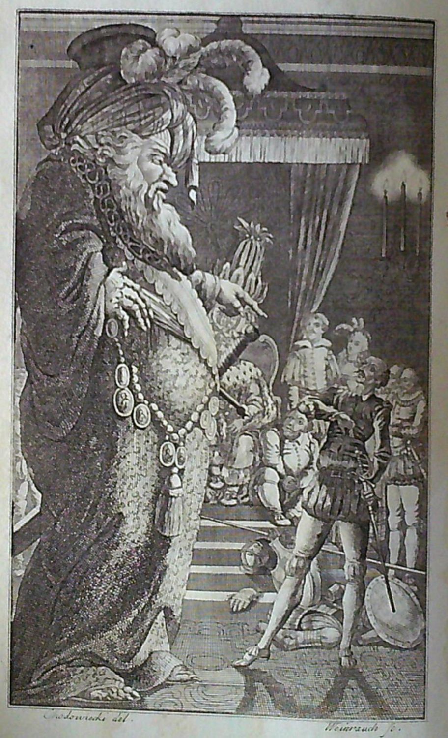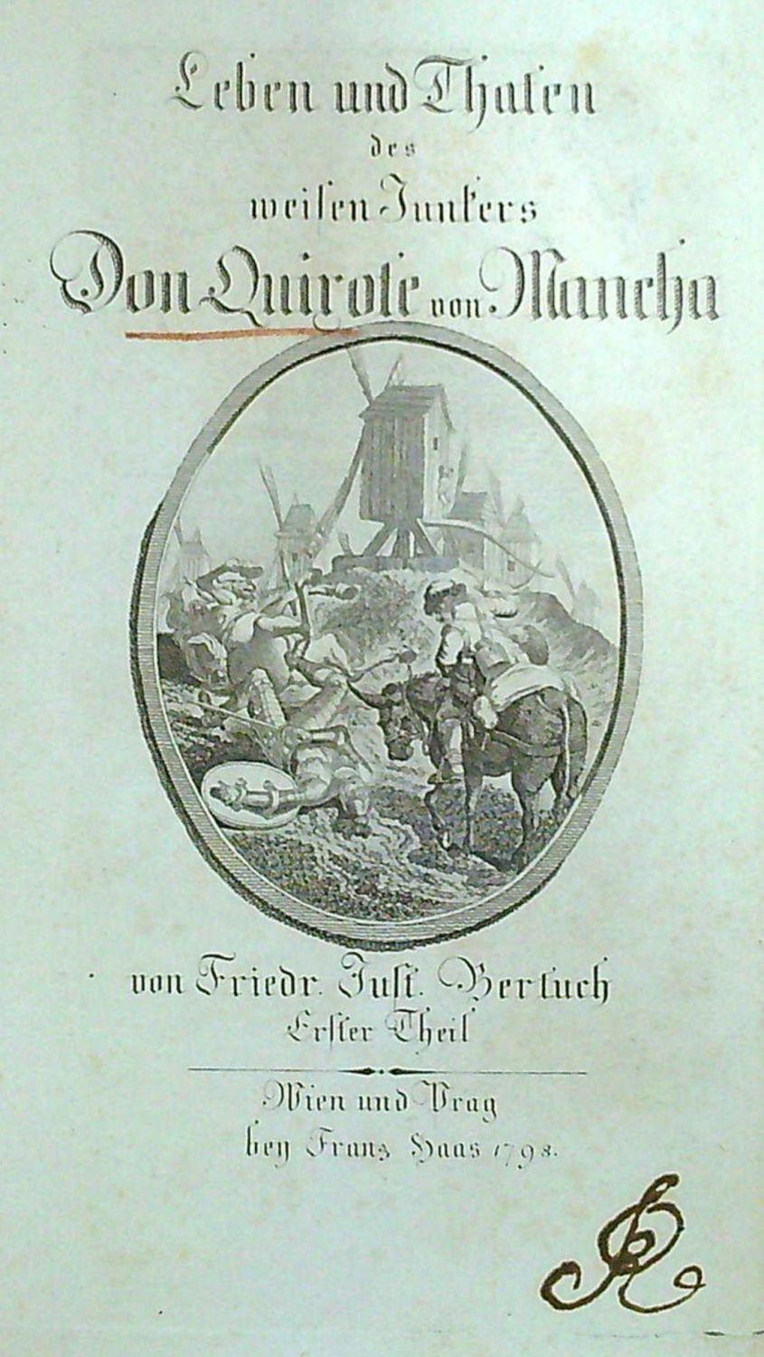 BCBT 13891<br>Tištěno gotikou, dvojité linky, tučně tištěné versálky, mizící linky. Na titulních listech všech šesti dílů mědirytiny v oválu (cca 69 x 56 mm) s vyobrazeními vztahujícími se k románu, ve front. všech šesti dílů mědirytiny, které dle Chodowieckého vyryl Weinrauch ve Vídni, na kterých jsou vyobrazeni Don Quixote a Sancho Panza v různých situacích. <br>Jednotné kartonové vazby potažené škrobovým papírem z 20. století. Na rubu titulních listů některých svazků staré provenienční maďarské razítko.<br>Do německého jazyka ze španělštiny přeložil Justin Friedrich Bertuch. Souborný katalog eviduje v Čechách pouze dvě kompletní vydání v NK ČR v Praze a v Moravské zemské knihovně v Brně.