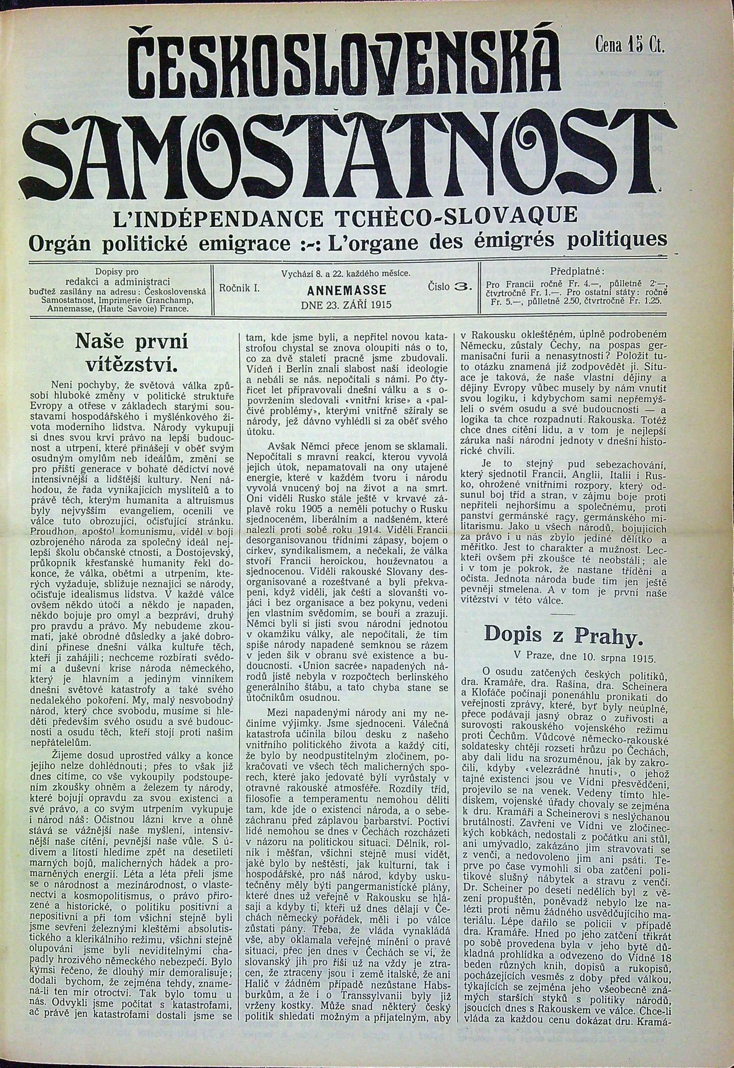 Kompletní vydání časopisu "Československá samostatnost", který vycházel nejprve v městečku Annemasse (do č. 15 prvního ročníku), poté v Paříži. Po vydavateli P. Granchampovi, krátkou dobu časopis vydával J. Schroeder a od čísla 15 prvního ročníku Francois Jackl. První a druhý ročník vyšel ve 24 číslech (á 8 stran), třetí v 38 číslech (á 6 nebo á 8 stran) a poslední ve 32 číslech (á 6 či á 8 stran). Odpovědným redaktorem byl Dr. Lev Sychrava a od čísla 17 4. ročníku Dr. Ivan Markovič. Kromě řady anonymních příspěvků, či opatřených šiframi, v časopisu publikovali mimo jiné TGM, E. Beneš, Karel Horký, Lev Sychrava, M. R. Štefánik. V několika číslech ilustrativní či fotograf. vyobrazení