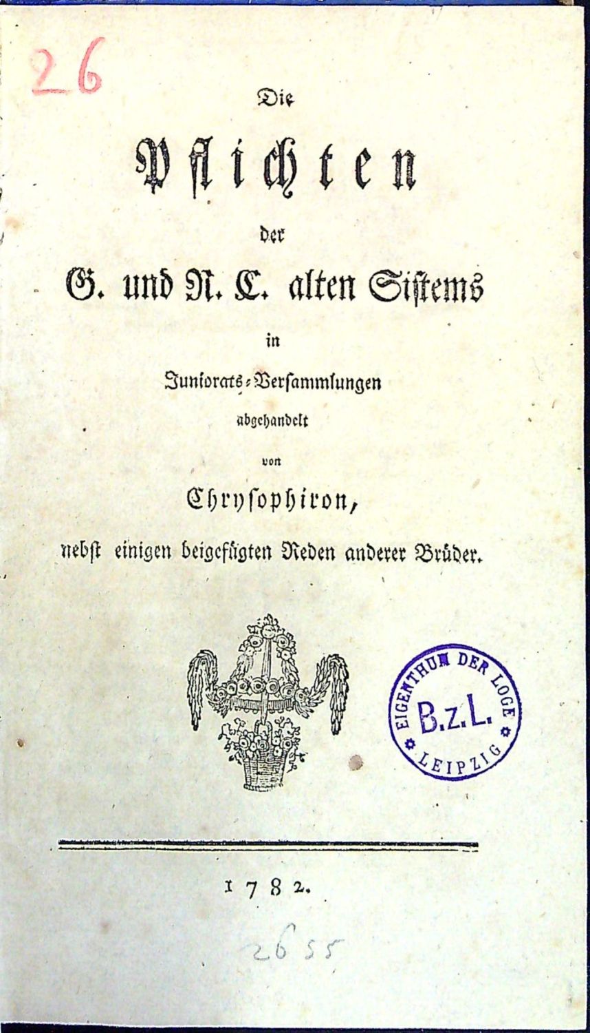 Die Pflichten der G.(old) und R.(rosen) C.(reutzer) alten Sistems in Juniorats=Versammlungen abzehandelt von Chrysophiron, nebst einigen beigefügten Reden anderer Brüder.