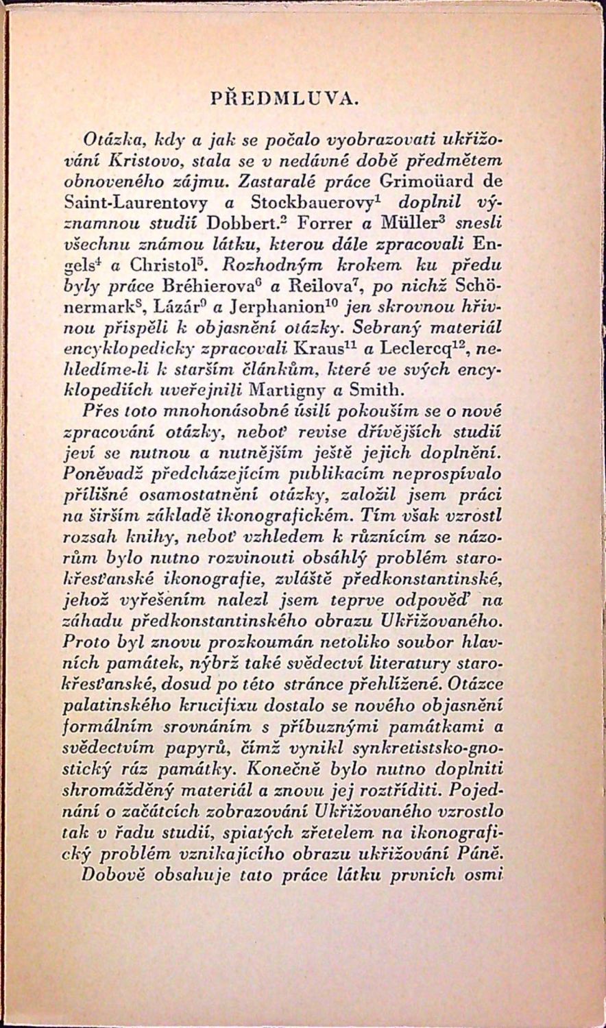 Původní pap. obálka s reprodukcí kresby V. H. Brunnera (Ježíš na kříži), který knihu též upravil. Obálka při okrajích místy lehce pomačkaná a ve hřbetu mírně odřená. Za textem na 12 listech přílohy 35 fotograf. vyobrazení s různými ukázkami křesťanské ikonografie a ukřižování.