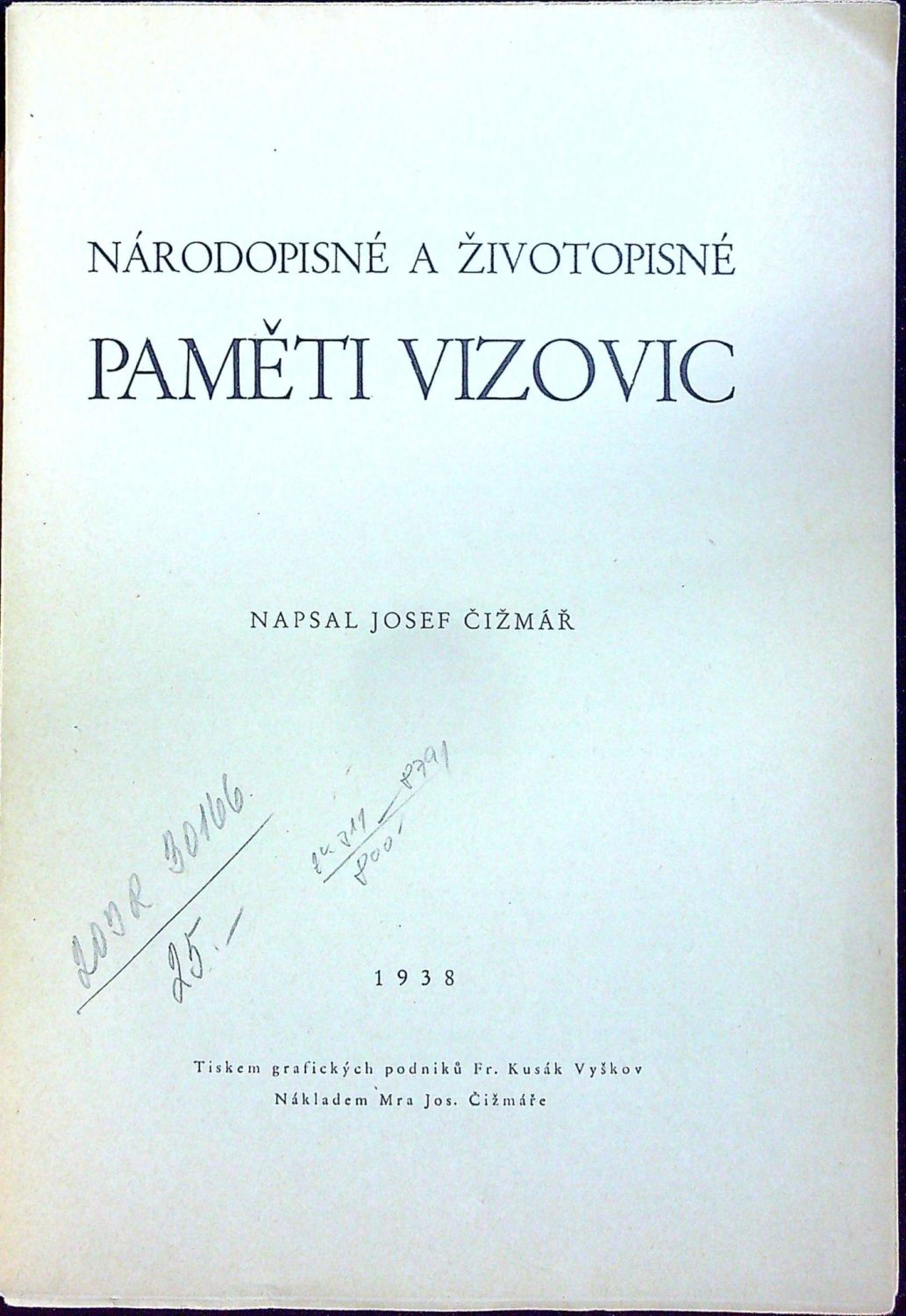 V textu několik fotograf. vyobrazení významných rodáků a několik notací písní spojených s regionem Vizovic. - Původní pap. obálka, při horním okraji hřbetu chybí cca 3 cm pap. pokryvu a začátek pokryvu zhruba ve stejné délce natržený. - Kniha doplňuje vydání Čižmařovy knihy "Dějiny a paměti města Vizovic" vydané vlastním nákladem roku 1933.