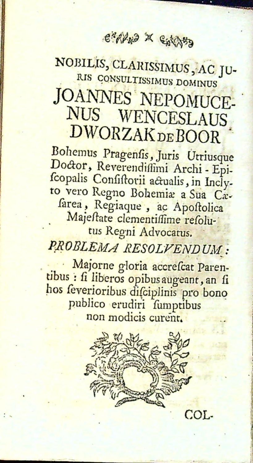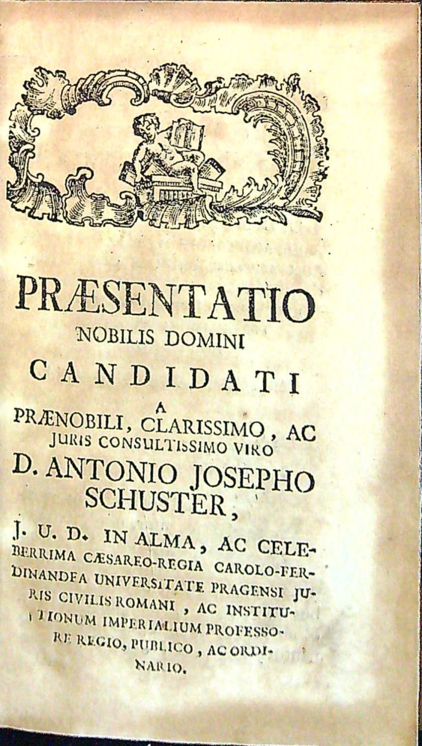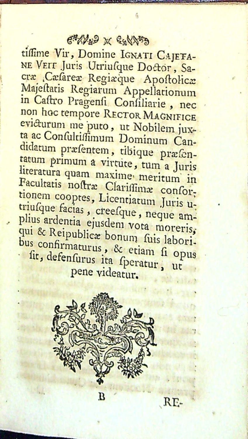 BCBT 13222<br>Uprostřed horního okraje drobné tiskařské ozdůbky, signatury, stránkové kustody, nepaginováno. Vstupní vlys s postavou putta (amoreta) s knihami v rámu z prolamovaných skořápek a škeblí, tučně tištěné versálky olemované ze tří stran rokokovými ilustracemi, rokokové viněty.<br>Dobová kožená vazba, lehce místy odřená a místy kůže mírně zkrabatělá. Ve hřbetu 4 vazy, stříkané ořízky. Ve spodním poli hřbetu starý pap. štítek.