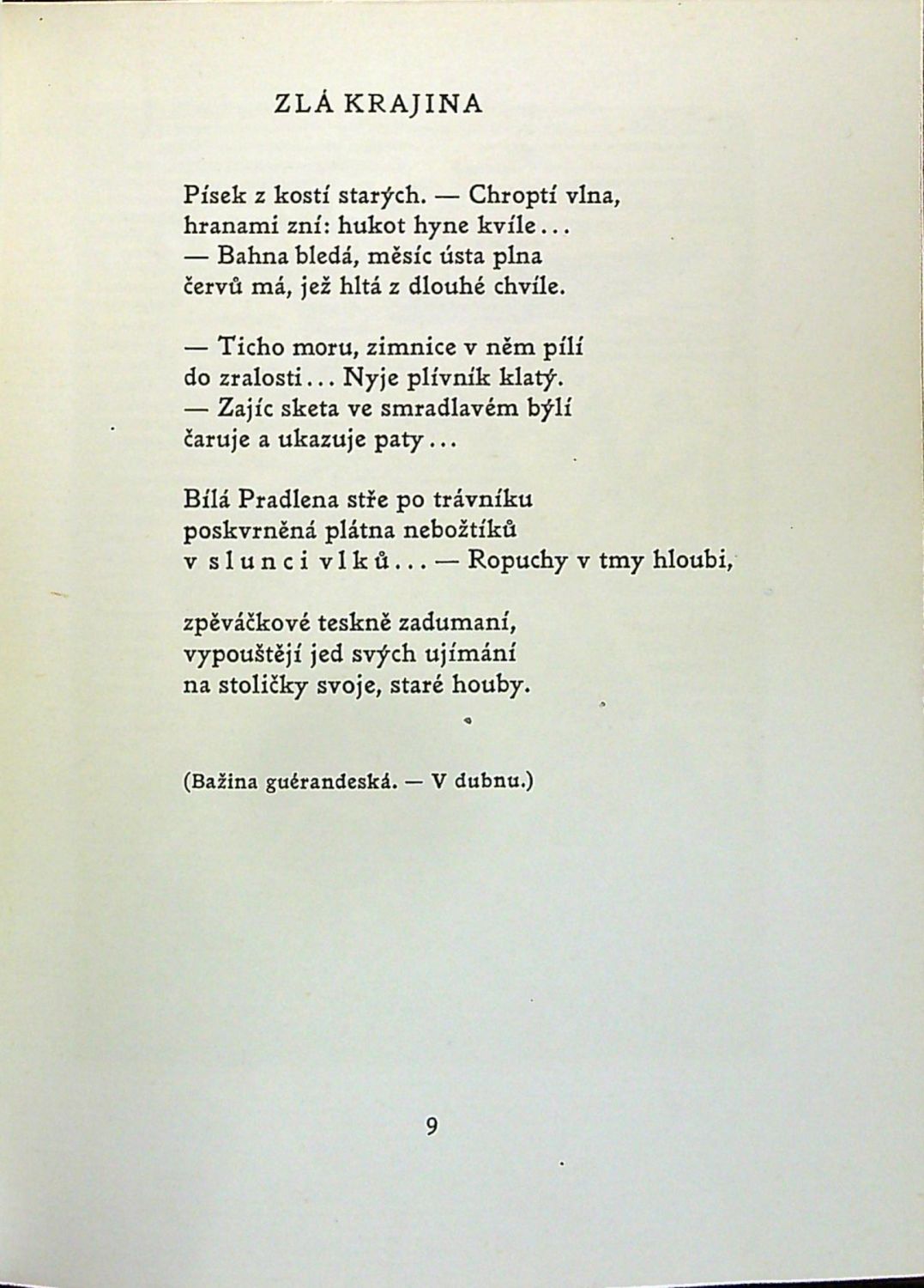 Jeden ze 108 exemplářů tištěných na rýhovaném papíru (12 exemplářů přednostních bylo tištěno na similijapanu), vytiskli Kryl a Scotti v Novém Jičíně, přeložil Bohuslav Reynek, který knihu též vlastním nákladem vydal.<br>Vazba z 30. let minulého století. Kartonové desky potažené máčeným papírem, kožený hřbet a nárožnice, ve hřbetu mezi tlačenými a zlacenými rostlinnými lištami tlačený a zlacený název, zlacená svrchní ořízka. Přední strana linorytové obálky vevázána.