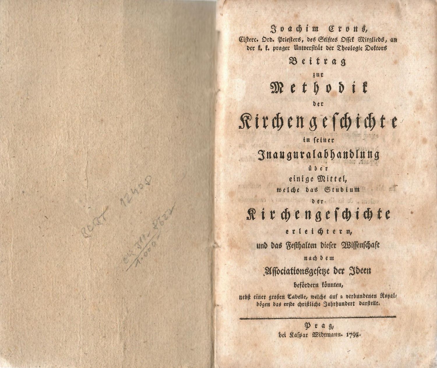 BCBT 1240; Goedecke VI, 730, č. 4; Wurzbach III, str. 30-31.<br>Tištěno švabachem, latinský text antikvou, řecký alfabetou, paragrafy, uprostřed horního okraje stran mizící linka. - Dobová pap. obálka potažená tragantovým papírem.<br>Joachim Antonín Cron (30.9. 1751 Podbořany - 20.1. 1826 klášter Osek) římskokatolický duchovní, osecký cisterciák a hudební skladatel. Několik let (1807-1815) byl děkanem pražské teologické fakulty. Hrál na klarinet a skleněnou harmoniku. Okolo roku 1782 zkomponoval skladbu "Operetta jocosa de Picorum captura", ve které se prolínají různé veselé motivy s jeho zážitky z vojenské služby. V roce 2011 operu upravili, dokomponovali a uvedli Jan Zástěra, Martin Budek a Miloslav Gloser.