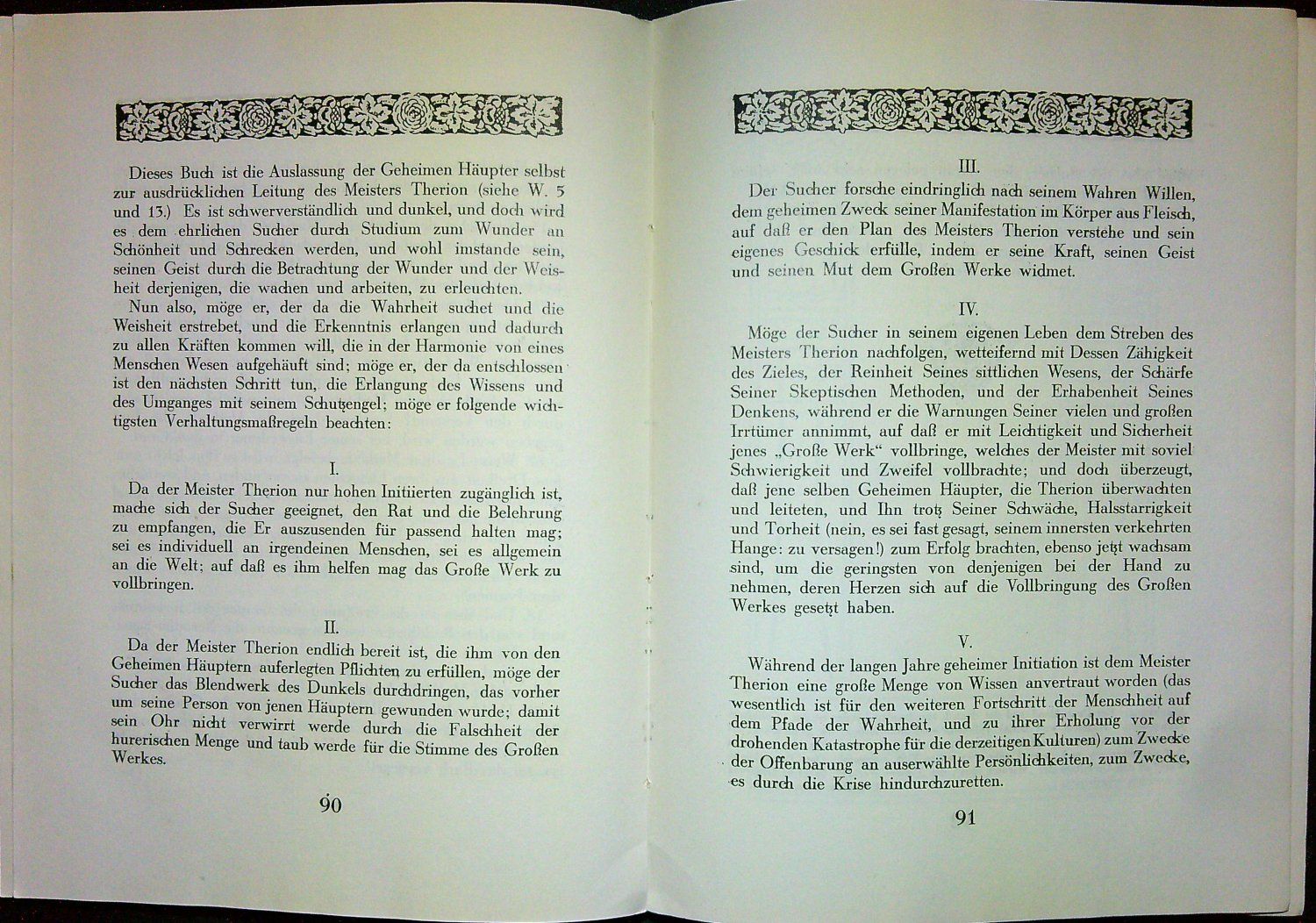 Ackermann V,939<br>Exemplář číslo 737 z neudaného počtu vydaných. V záhlaví stran pásové lišty zdobené rostlinným ornamentem, předtitul zasazený v borduře zdobené různými okultními emblémy, viněty, titulní listy jednotlivých pojednání v rámečku z ornamentů (celkem devět), na straně 93 je pojednání "Das Herz des Meisters" od Khaled Khana, ve skutečnosti od A. Crowleyho, které autor napsal roku 1924 a anglicky bylo publikováno až v roce 1938. Kniha dále obsahuje: "Liber II. Die Botschft des Meisters Therion"; "LXI vel Cause"; "Postkarten an Lehrlinge"; "Liber III vel Jugorum"; "Liber H H H sub. Figura CCCXLI"; "AHA!"; "Der Meister Therion"; "Ein Stern in Sicht" und "Kleine Mitteilungen". V úvodu díla je předmluva vydavatele A. Fra. Recnartuse (= Heinrich Tränker). - Původní kartonová vazba s barevnou ilustrací na přední straně, plátěný hřbet. Vazba lehce zaprášená. <br>Na přední straně vazby je vyznačeno Abteilung VII., Bd. 1. (ve skutečnosti se jedná o 4. svazek z 12 vydaných svazků Pansophia-Verlag). - "Collegium Pansophicum" založili roku 1921 Heinrich Tränker a Karl Germer. Heinrich Tränker (6.8. 1880 - 22.5. 1956), rosenkrucián, antikvář, okultista a teosof, vystupující pod jmény Frater Recnartus, Garuda a Henkelkreuzmann. Již za první světové války založil v Lipsku Pansofickou lóži. V roce 1925 se seznámil s Alaisterem Crowleyem, kterým byl nejprve fascinován, ale poté co se Crowley prohlásil za spasitele světa došlo mezi nimi k zásadnímu rozkolu, Crowley prohlásil Tränkera za Jidáše a Pansofická společnost byla 1. dubna roku 1926 rozpuštěna. <br>Karl Johannes Germer (22.1. 1885 Elberfeld - 25.10. 1965 West Point, Kalifornie), německý okultista, známý pod jménem Frater Saturnus. Roku 1926 odjel do USA, roku 1935 poté co mu vypršelo americké vízum, se vrátil zpět do Německa, téhož roku byl zatčen gestapem a poté vězněn v Berlíně a pak v několika koncentračních táborech. Nakonec se jeho americké manželce podařilo získat pro Germera americké vízum a ten byl roku 1941 propuštěn z tábora Gurs a odjel do USA. Germer byl po celý život podporovatelem A. Crowleyho, který ho roku 1942 jmenoval svým nástupcem v čele řádu "Ordo Templi Orientis" a po jeho smrti roku 1947 se jím stal.