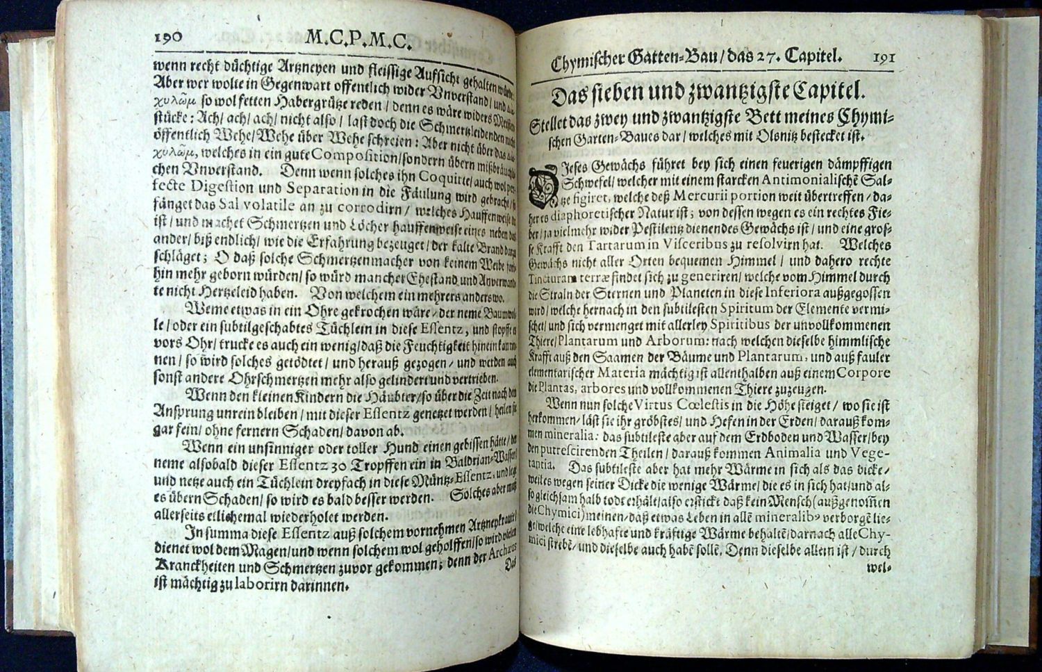 Nová kartonová vazba potažená škrobovým papírem, kožený hřbet s tmavě hnědé teletiny se třemi vazy, kožené nárožnice. Odborně a citlivě restaurováno. Na tit. listu a dalších čtyřech stranách dolity chybějící kousky papíru, titulní list mírně zašpiněn, po jeho okraji souběžně s okrajem stránky stará poznámka inkoustem, ozdobné iniciály ve výši tří řádek, na tit. listu a několika místech textu dřevořezové viněty. Ve stavu velmi dobrém.<br>Za titulním listem autorova dedikace saskému vévodovi Johannu Georgovi. První vydání vzácného hermetického spisu Michaela Crügnera, lékaře v Drážďanech.<br> Neuer Halblederband auf drei Bünden, neue Vorsätze, es fehlt Portrait-Frontispiz. Fachmännisch restauriertes Exemplar, einige Fehlstellen (meistens an den Rändern) ergänzt. Titel etwas beschmutz, mit Besitzvermerk. Gutes Exemplar dieses seltenen Werks. Erste Ausgabe einer hermetischen Schrift von Michael Crügner, der ein berühmter Dresdener Artz und Spagyriker war. Hinter dem Titel 12- seitige Widmungsschrift des Verfassers für Jahann Georg Herzog zu Sachsen. Der Verfasser entwickelte in seinen zahlreichen Werken ein System der hermetischen und spagyrischen Heilkunde und beschreibt nicht nur das Sammeln von Heilpflanzen sondern auch zahllose Therapievorschläge und mannigfaltige Rezepte für Elixiere, Essenzen usw. Ganz besonderen Wert legt Crügner auch auf astrologische Details. Die Haliographie (eigener Titel ab S. 231) ist eine Beschreibung der verschiedenen Salzmineralien, d. h. der bei Verbrennung von Pflanzenübrigbleibenden festen Stoffe.<br>Fergusson I, 189-190.