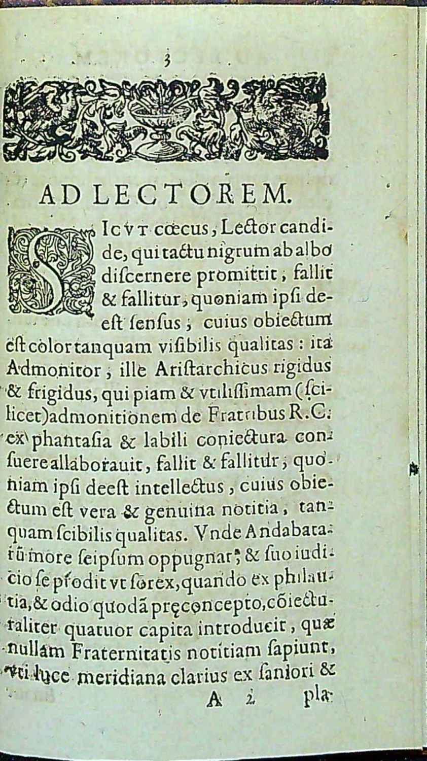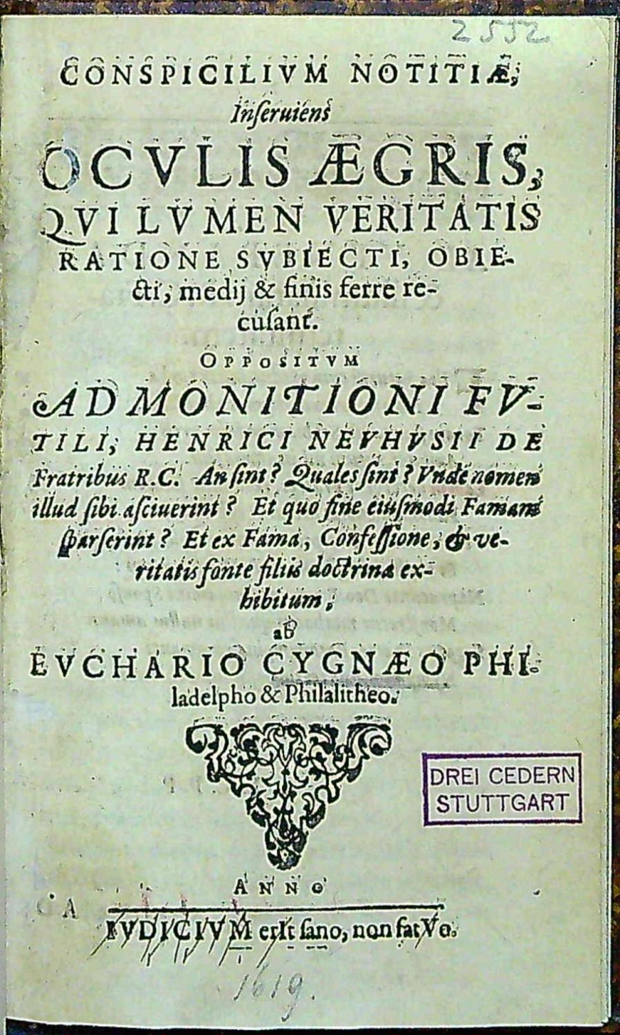CONSPICILIVM NOTITIAE, Inseruiens OCULIS AEGRIS, QVI LVMEN VIRITATIS RATIONE SVBIECTI, OBIEcti, medij & finis ferre recusant. OPPOSITVM ADMONITIONI FVTILI, HENRICI NEVHVSII DE Fratribus R.C. an sint? Quales sint? Vnde nomen illud sibi asciuerint? Et quo sine eiusmodi Famam sparserint? Et ex Fama, Confessione,et veritatis fonte filiis doctrina exhibitum, ab EVCHARIO CYGNEO PHIladelpho & Philalitheo.