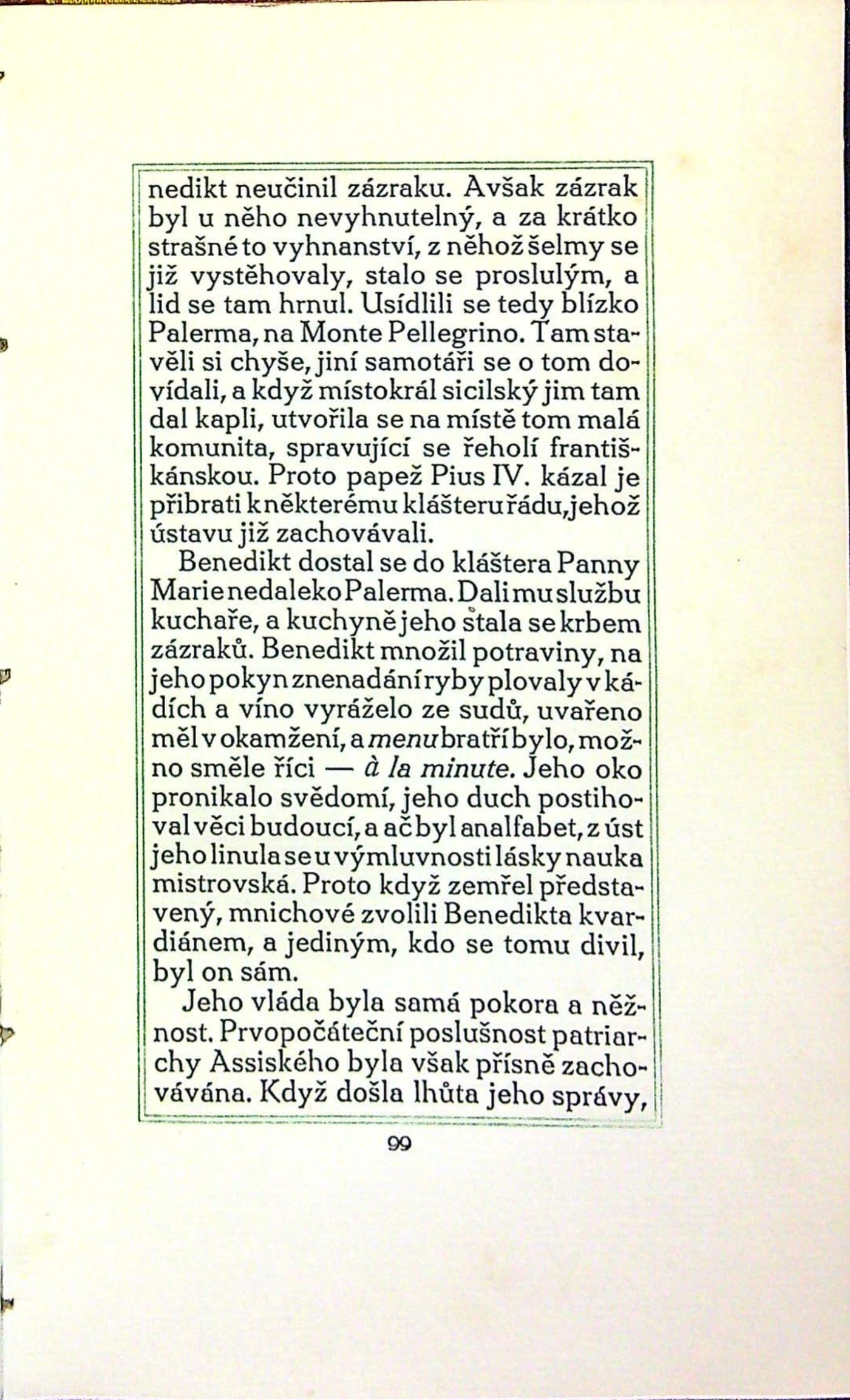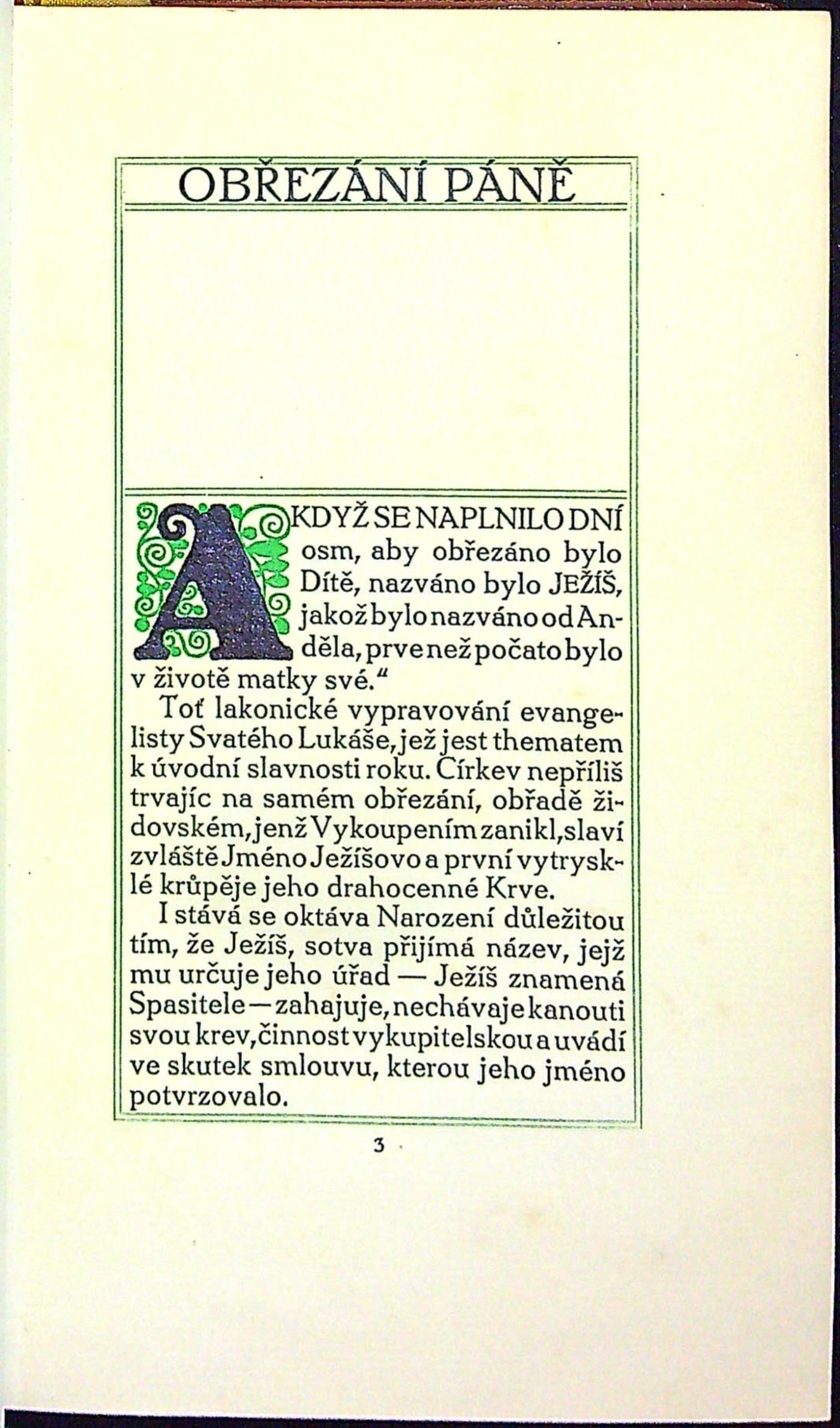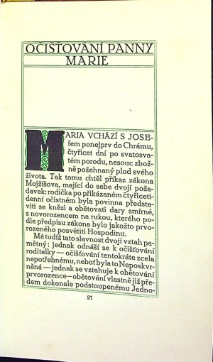 Jeden z 380 vydaných výtisků tištěných na rýhovaném papíře s průsvitkou, předsádky z ručního papíru Roma, dvoubarevný tisk, všechny strany textu jsou zarámovány ve dvojitém zeleně tištěném rámečku, široké okraje, arabské číslování stran pod rámečkem uprostřed, v textu řada dvoubarevně tištěných plných iniciál na rostlinném pozadí zalomených do výše pěti řádků, na tit. listě viněta, na listech se jmény jednotlivých měsíců vícebarevně tištěné ilustrace, zčásti zlacené, vše práce Karl Schwetze, který knihu též graficky upravil. - Dobová kožená vazba, ve hřbetu tlačený a zlacená název a při jeho horním i spodním okraji tlačený a zlacený ornament, barvená svrchní ořízka.