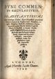 + přívazek: "DYNI (= Dino del Mugello) COMMEN. IN REGVLAS IURIS. PRAESTANTISSIMI iuris vtrisque Docto. Dyni Muxellani uberrimus Commentarius in Regulas Iuris Pontificij, Legalis discipline studiosis vtilissimus, Anotamentis Domini Nicolai Boërij (= Nicolas de Bohier) Regij Co[n]siliarij & Praesidis in Senatu Burdegale[n]si dilige[n]ter illustratus, ac quam plurimis, quae hactenus corrupta fuerat, neperimme suo nitori restitutis, emendatior redditus. Index Alphabeticus operi no[n] inuenuste praefixus est". Lugduni (Lyon), Jacob Guinta, 1548, 132 + 20 listů. Na tit. listu drobná viněta, v závěru signet nakladatelův, konturové iniciály na rostlinném i ilustr. pozadí zalomené do výše 3-7 řádků, tisk ve dvou a třech sloupcích (vlastní text uprostřed, či při vnitřním okraji olemovaný tištěnými poznámkami. (KVK neeviduje, WorldCat eviduje 1 ex. na universitě v Illinois).