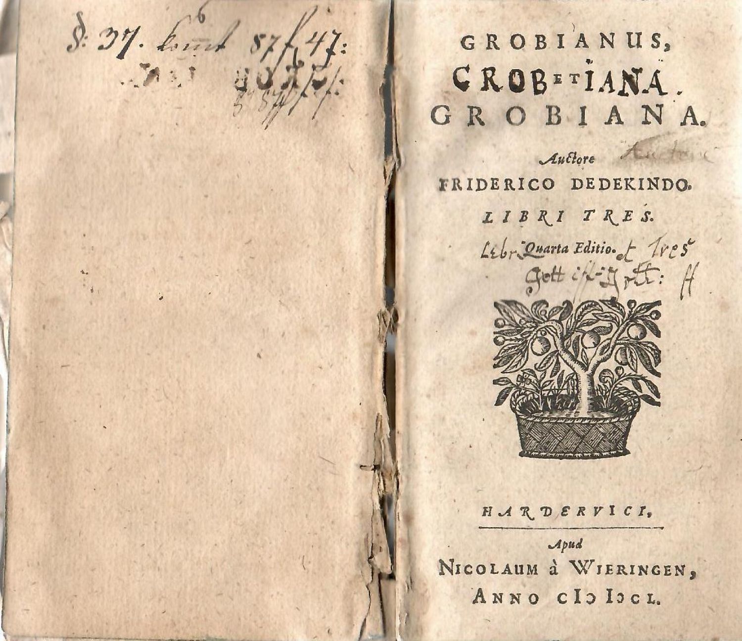 Na tit. listu dřevořezová viněta, tučně tištěné plné iniciály ve výši 2-5 řádků, živá záhlaví.<br>Friedrich Dedekind (1524 - 1598), byl německý humanista, knihkupec a protestantský kněz, jeho satira vyšla poprvé latinsky roku 1549 ve Frankfurtu nad Mohanem a poté v dalších vydáních v několika jazycích. Česky vyšla porvé roku 1647 v Litomyšli a pak ještě v několika vydáních po polovině 18. století.<br> + 1. přívazek (tři Kornmannovy práce): Kornmann, Henric "Sibylla Trig-Andriana Seu de VIRGINITATE, VIRGINUM STATU Et Jure TRACTATUS NOVUS Et Iucundus: Ex Jure Naturali, Divino, Canonico & Civili, Scriptoribus Ecclesiasticis & Prophanis, in gratiam Physicorum, Medicorum, Theologorum, & Juridicorum, paratus". "LINEA AMORIS sive COMMENTARIUS In Versiculum Glossae, Visus, Colloquium, Convictus, Oscula, Factum ...". "DE ANNULO TRIPLICI: USITATO, SPONSALITIO, SIGNATORIO: Tractatus absolutissimus, in ters partes divisus". Hagae-Comitum (Haag), Adrian Vlacq, 1654, [XXIV]-214-117-[III]-69-[III] stran, na tit. listech drobné dřevořezové vinětky, pásové vlysy z ornamentů, konturové iniciály na rostlinném pozadí ve výši 4-5 řádků, tučně tištěné versálky ve výši 2-3 řádků, živá záhlaví.<br>Heinrich Kornmann (1579 Kirchhein - 1628 Kirchhein), německý právník, studoval v Marburgu a poté v Římě, kde získal titul doktora obojího práva. Ve svých traktátech se autor odvolává na řadu pramenů, včetně klasických autorů a děl církevních otců. Do jisté míry hájí práva žen, ale též opakuje řadu různých pověr. Pojednává též o inkubech a sukubech, astrologii, barvě ženských oděvů a jejich významu, ... V prvním traktátu se zabývá právy a povinnostmi žen a jejich chováním v sexuálních záležitostech, v dalším o pěti fázích lásky (pohled, rozhovor, fyzický kontakt, líbání a vyvrcholení), ve třetím prstenům (včetně zásnubních) a jejich významu. Prvé dva traktáty vyšly poprvé ve Frankfurtu nad Mohanem roku 1610.<br>+ 2. přívazek: Hanotel, Philipp "MUNDI STULTITIA COMPENDIO demonstranta Opera ....". Bruxell, Francisci Foppens, 1655, 110-[VII] stran, na tit. listu dřevořezová viněta, koncová viněta, konturové iniciály na rostlinném pozadí zalomené do výše 7 řádek, živá záhlaví. <br>Philippe Hanotel (1600-1637), jesuitský teolog.<br>Dobová pergamenová vazba, ohmataná a zašpiněná, při spodním okraji přední desky mírně okousaná, při horním okraji hřbetu inkoustem psaný název, ve spodní části hřbetu chybí část pergamenového pokryvu. Na předním vakátu rkp. provenienční přípis z roku 1803 "Franz Anton Czerny", na tit. listu stará poznámka perem, na jeho rubu prov. přípis "Ex Bibliotheca Conventus Pragensis ordinis ....". Papír místy zahnědlý, několik posledních listů při vnějším okraji lehce pomačkaných.