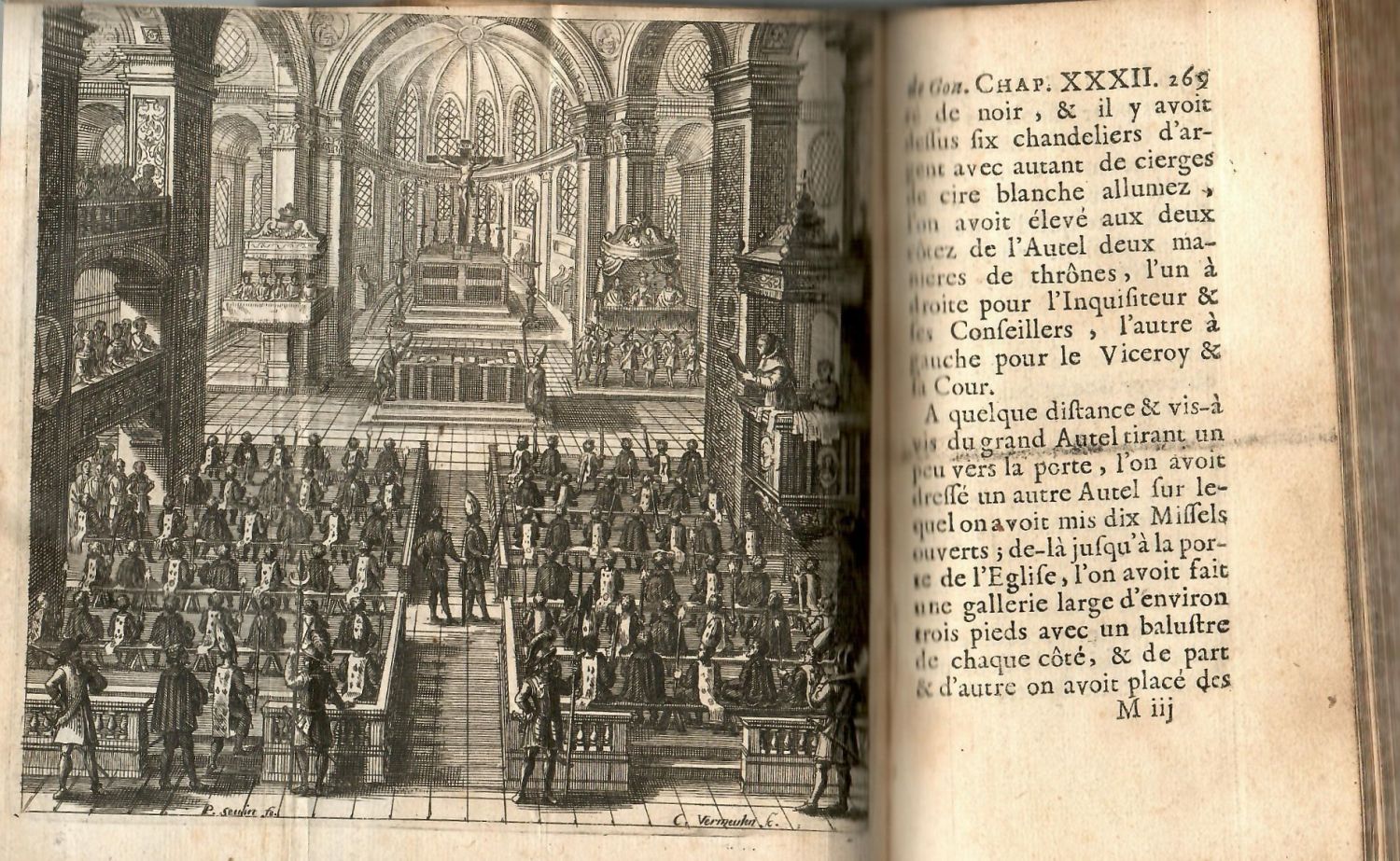 | Ilustrace: | Na titulním listu a na straně 275 do mědi ryté viněty, na úvodních listech a v textu na str. 1, 122 a 252 celkem šest mědirytinových vlysů (45 x 80 mm), na úvodním vlysu portrét mademe Du Cambout de Coislin, v úvodu jí adresovaného přetištěného dopisu. V textu 6 mědirytinových příloh, tři celostr. s vyobrazením postav heretiků, kteří mají na speciálních tunikách zobrazen svůj osud (Samarra, Fuego revolta, Sambenito), na třech rozkládacích vyobrazení průvod inkvizice, zasedání v kostele a vyvedení odsouzených k upálení na hranici. Všechny práce signovány C. Vermeulen (rytec) dle F. Seuina. |