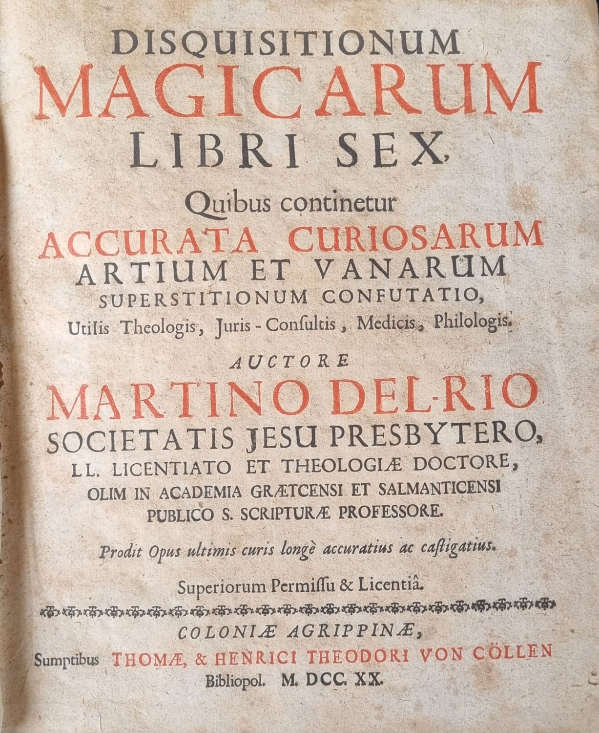 Červeno-černě tištěný titulní list, živá záhlaví, tištěné poznámky po stranách, sazba ve dvou sloupcích, tučně tištěné versálky ve výši 2-5 řádků, viněty, na str. 366 konturová iniciála na ornamentálním pozadí zalomená do výše 6 řádků, pásové lišty a ryče z rostlinného ornamentu. <br>Dobová vazba z temně hnědé hověziny, ve hřbetu 5 vazů, ve druhém poli světlý kožený štítek s tlačeným názvem, v ostatních polích tlačený ornament. Vazba ohmataná a místy lehce odřená, při horním okraji hřbetu torso starého pap. knih. štítku. Při horním okraji hřbetu kůže natržená a na několika místech proděravělá od červotoče, při spodním okraji hřbetu kůže okousaná. Papír místy zahnědlý, na zadním přídeští v rozích cestičky od červotoče, lehce naražené rohy.<br>Martin Anton Delrio (17.5. 1551 Antverpy - 19.10. 1608 Leuven), nizozemský jesuitský teolog a právník, přítel vlámského humanisty Justuse Lipsia. Nabízené dílo je jeho nejslavnější knihou, poprvé vyšla v letech 1599-1600 v Lovani a pojednává o magii, čarodějnictví a různých pověrách.