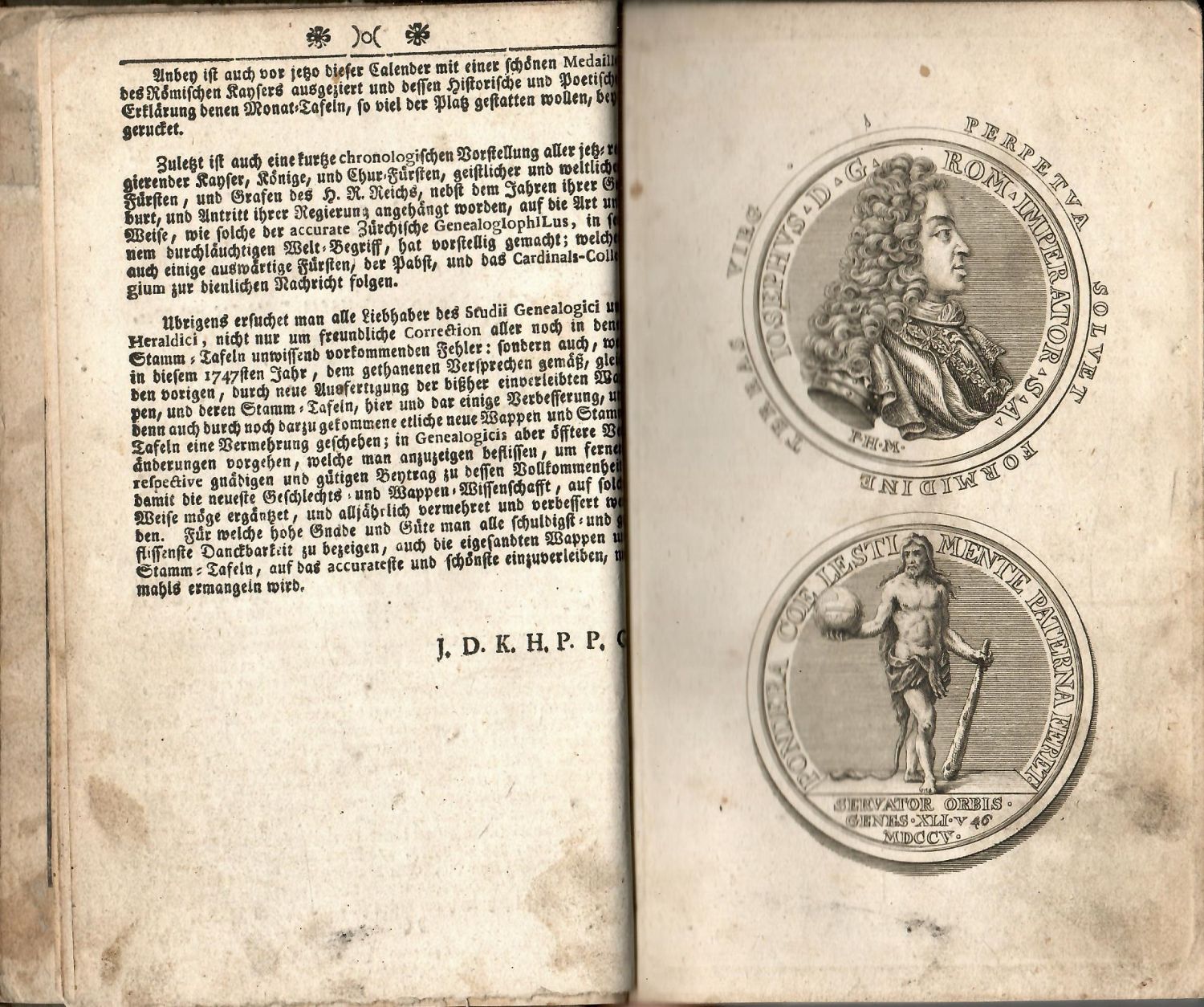 Der Durchlauchtigen Welt zum fünf und zwantzigstenmahl neu vermehrter und verbesserter Geschichts = Geschlechts = und Wappen=Calender auf das Jahr nach der heilbringenden Geburth JEsu Christi 1747. Nebst historischer Erklärung eines einer Medaille des Römischen Kayser Josephs. Auch kurtz gefasten Vorstellung aller jetzt regierender Kayser, Könige, Churfürsten, geistlicher und weltlicher Fürsten, und Grafen des H. R. Reichs, nach ihren Lebens= und Regierungs=Jahren; wie auch einiger auswärtiger Fürsten, des Pabstes, und die Cardinäle. Mit allergnädigsten Kayserl. Privilegio.