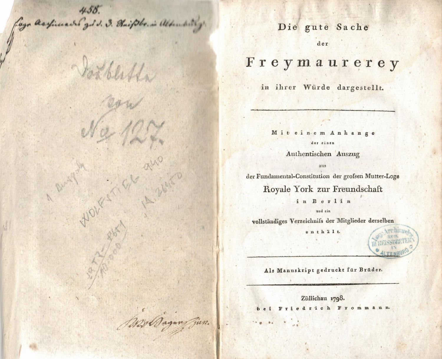 Die gute Sache der Freymaurerey in ihrer Würde dargestellt. Mit einem Anhange der einen Authentischen Auszug aus der Fundamental-Constitution der grossen Mutter-Loge Royale York zur Freundschaft in Berlin und ein vollständiges Verteichniss der Mitglieder derselben enthält. Als Manuskript gedruckt für Brüder.