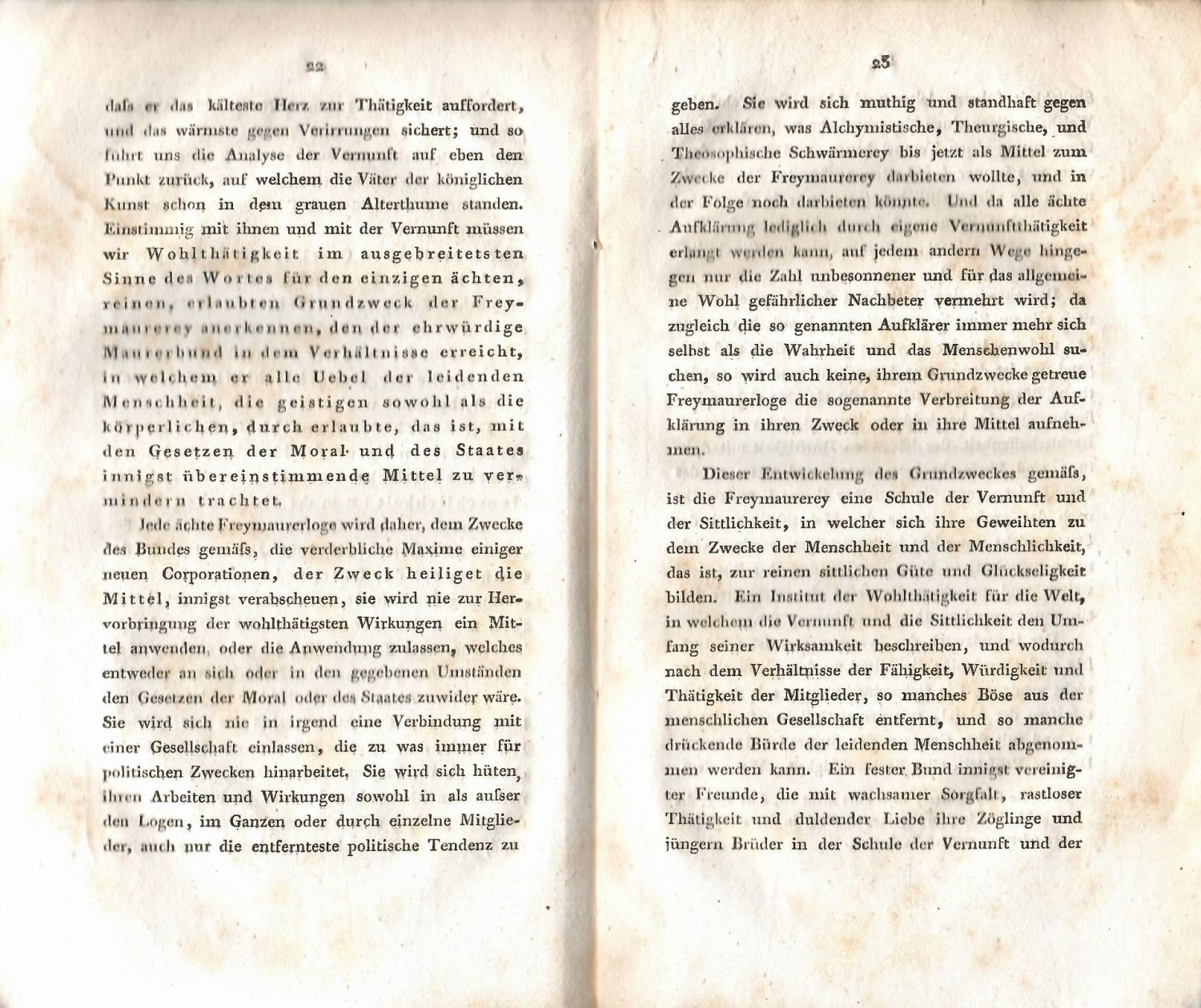 Wolfstieg 940<br>Tištěno antikvou, kantáta v úvodu pokurzivou, tištěné poznámky pod čarou.<br>Dobová obálka z modře barveného papíru, při horním okraji hřbetu chybí v délce cca 3 cm pap. pokryv obálky, přes hřbet přelepeny dva staré pap. knih. štítky, pap. obálky lehce zašpiněný a mírně zvlněný. Na předním přídeští rkp. provenience z 19. století a na tit. listu staré razítko zednářské lóže "Archimedes .." v Altenburgu. Místy drobné hnědé flíčky způsobené kyselostí papíru, při horním vnitřním okraji papír mírně zvlněný, oslí uši. - V nabízené práci jsou mimo jiné na straně 55-72 vypsané dějiny berlínské zednářské lóže "Royale York" a v závěru seznam členů lóže.