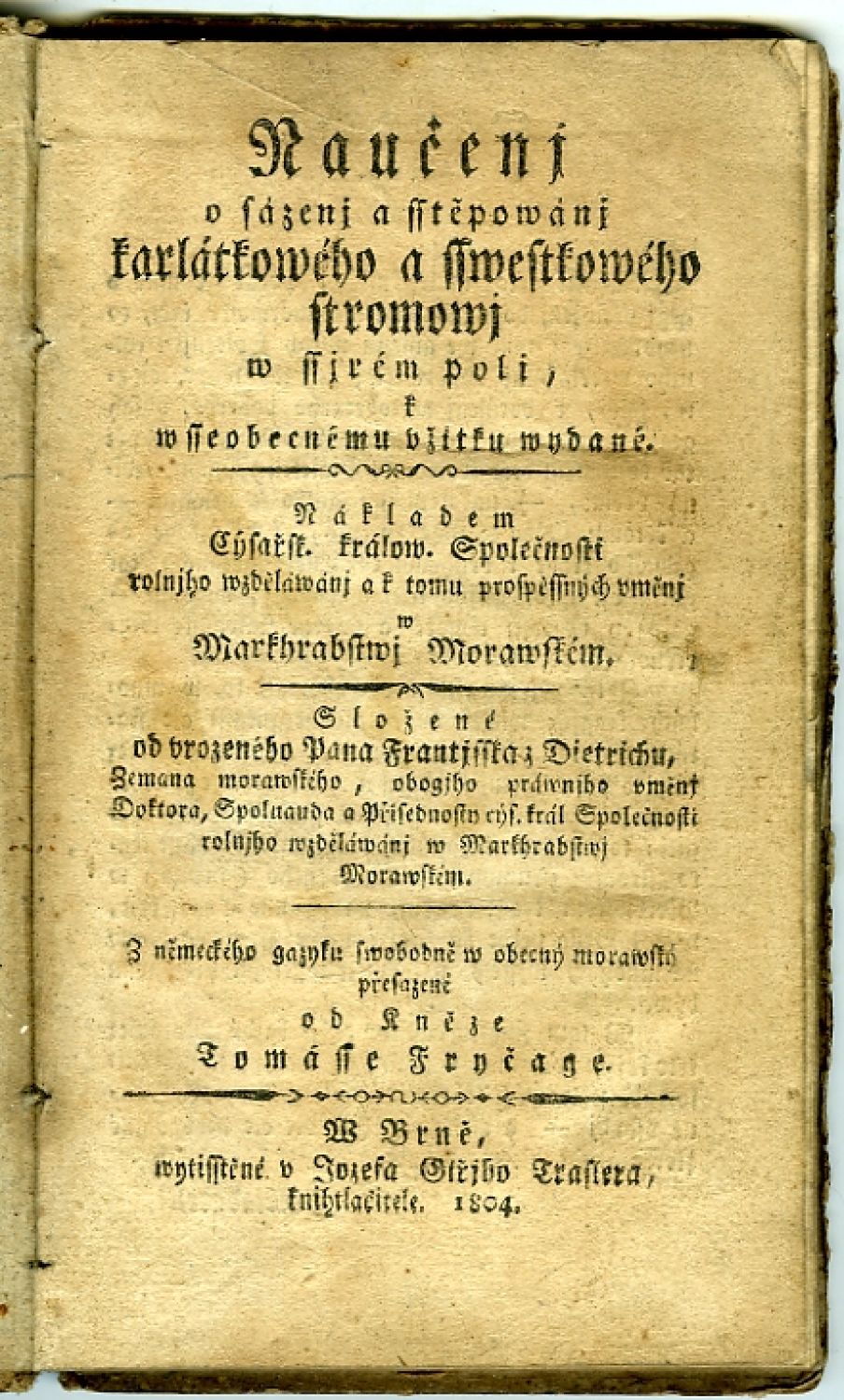 Naučenj o sázenj a sstěpowánj karlátkowého a sswestkowého stromowj w ssirém poli, k wsseobecnému vžitku wydané. Nákladem Cýsařsk. králow. Společnosti rolnjho wzděláwánj a k tomu prospěssných vměnj w Markhrabstwj Morawském. Složené od vrozeného Pana Frantjsska z Dietrichu, Zemana morawského, obogjho práwnjho vměnj Doktora, Spoluauda a Přednosty cýs. král Společnosti rolnjho wzděláwánj w Markhrabstwj Morawském. Z německého gazyku swobodně w obecný morawský přesazené od Kněze Tomásse Fryčage.