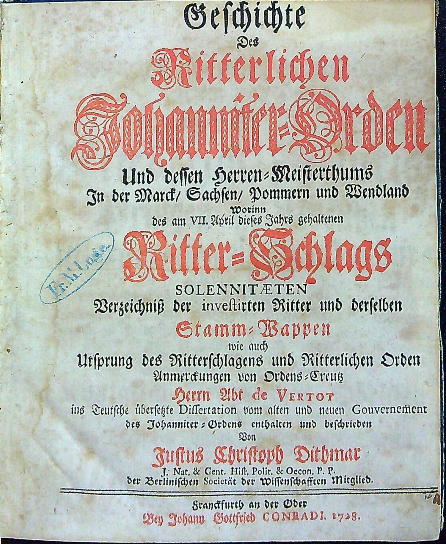 Geschichte Des Ritterlichen Johanniter=Orden Und dessen Herren=Meistertmums In der Marck/ Sachsen/ Pommern und Wendland Worinn des am VII. April dieses Jahrs gehaltenen Ritter=Schlags SOLENNITAETEN Verzeichniss der investirten Ritter und derselben Stamm=Wappen wie auch Ursprung des Ritterschlagens und Ritterlichen Orden Anmerckungen von Orden=Creutz Herrn Abt de Vertot ins Teutsche übersetzte Dissertation vom alten und neuen Gouvernement des Johanniter=Ordens enthalten und beschrieben Von Justus Christoph Dithmar.