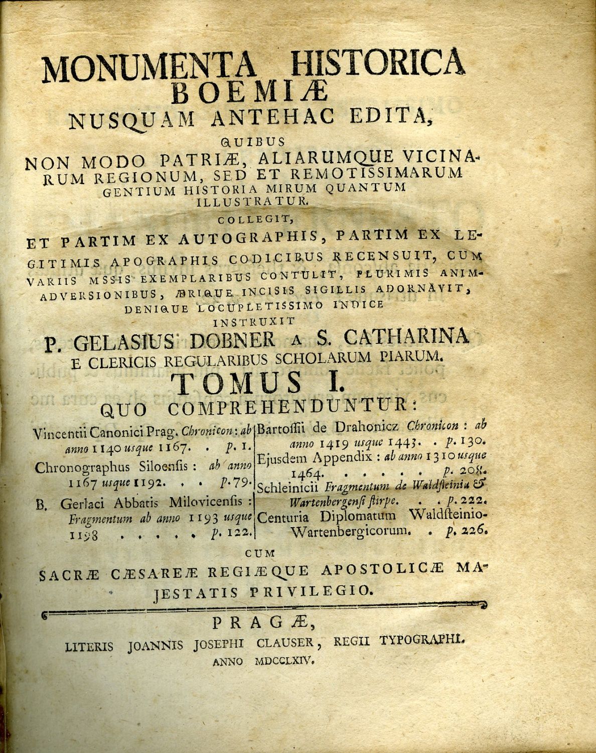 Zíbrt II,186; Pumprla I/6, 3101; Voit I, 211<br>Latinský text antikvou, německý a český gotikou, signatury, stránkové kustody, arabské číslování stran při horním vnějším okraji, živá záhlaví (místy jen ozdůbky rostlinného charakteru, v záhlaví jednotlivých částí vlysy z ozdobných linek, poznámky pod čarou, plné verzálky na rokokovém figurálním pozadí, koncové ozdůbky a viněty, mezi str. 226-227 tři celostránkové mědirytinové přílohy s vyobrazením církevních a světských erbů.<br>Dobová kartonová vazba potažená jemnou tkaninou, vazba zašpiněná a tkanina místy potrhaná, na obou deskách vazby patrné zbytky po vázacích tkanicích, zlacené ořízky. na předsádkách dobový mramorovaný papír na slizu.>Pouze 1. díl ze 6 dílů vydaných v letech 1764-1785, který obsahuje mj. kroniky kanovníka Vincentia, Jarlocha a Bartoška z Drahonic. <br>Gelasius Dobner (1719-1790), prefekt piaristické koleje v Praze, historik a vychovatel. Jeho Monumenta přinášejí kriticky zhodnocené vyprávěcí prameny k českým dějinám; za tento svůj obdivuhodný přínos české osvícenské vědě byl roku 177ě jmenován císařsko-královským hagiografem.