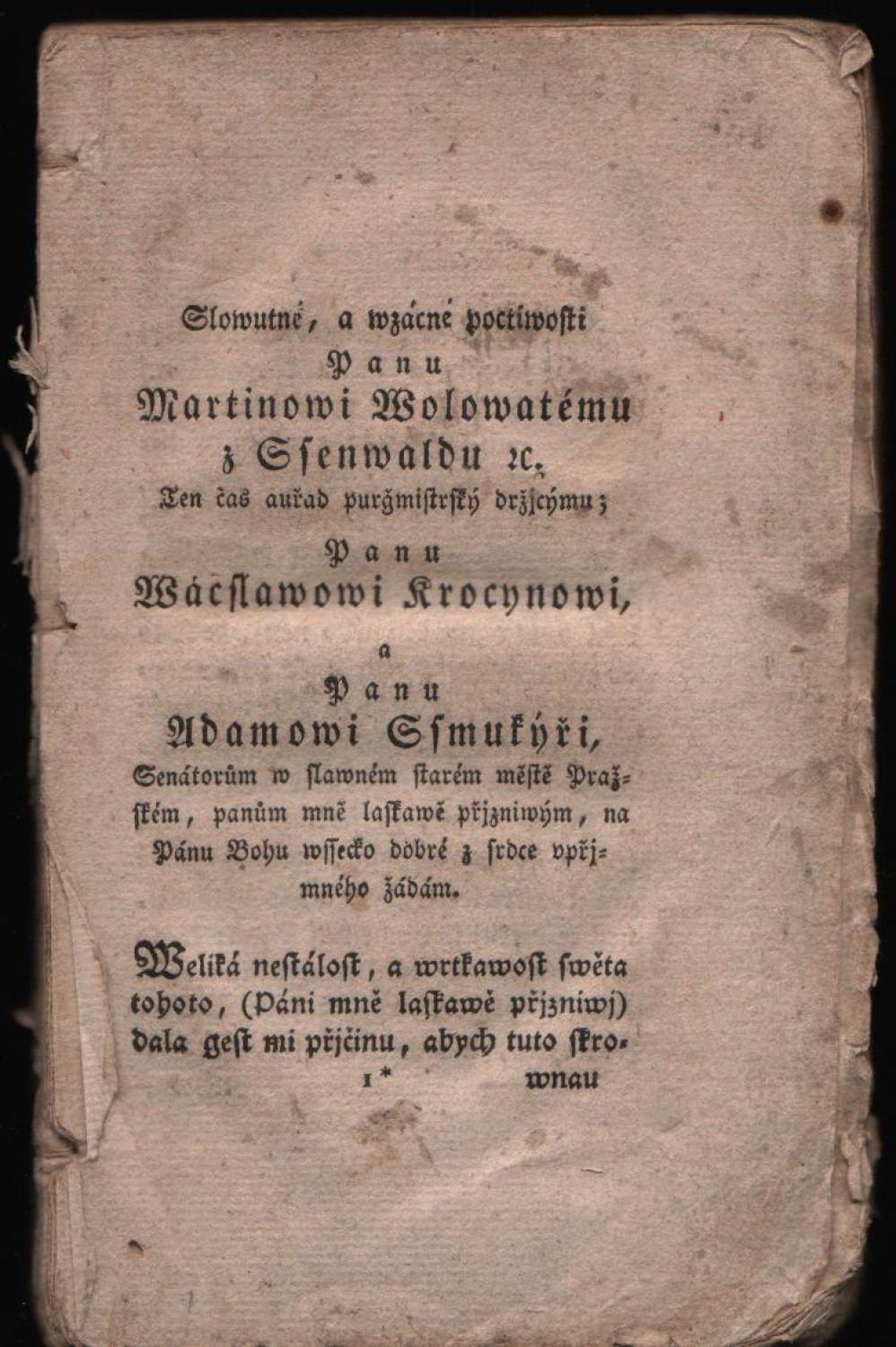 Jungmann IV,673 d<br>Český text gotikou, signatury, stránkové kustody, arabské číslování stran při horním vnějším okraji, uprostřed horního okraje křížek mezi pomlkami, zdůrazněně tištěné nadpisy kapitol, plné iniciálky ve výši dvou řádků.<br>Papír zahnědlý, chybí tit. list a přední strana původní empirové pap. obálky. K vydání připravil Václav Radimír Štěpán.<br>Václav Dobřenský (narozen před rokem 1550 - 1595 Praha), český spisovatel a sběratel drobných humanistických tisků. Autor několika mravokárných spisů v českém jazyce, ze kterých je nejznámější spis proti opilství a nezřízenému požívání alkoholických nápojů "Věník fíkový" (1587). Námi nabízené dílo vyšlo původně roku 1583 v Praze.