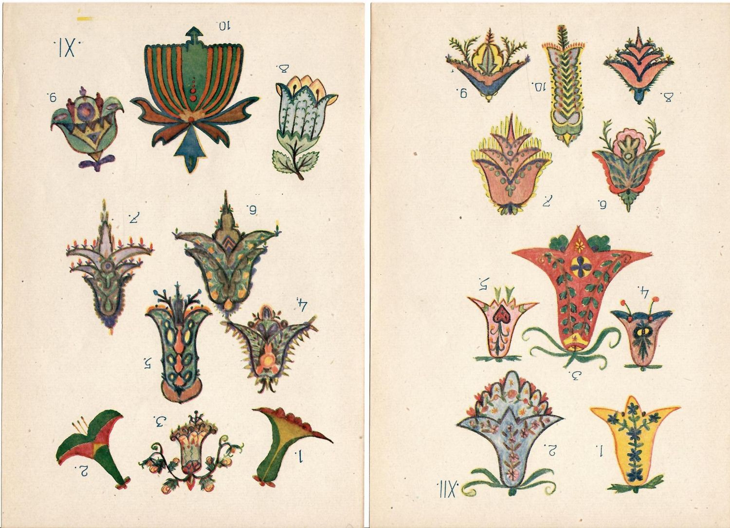 Poloplátěná vazba. Desky potaženy světle zeleným papírem. V knize vevázány dvě papírové chlopně (z toho jedna natržena), ve kterých je uloženo celkem 16 listů s barevnými reprodukcemi ornamentálních kreseb. Listy stářím zažloutlé. Na titulním listu tužkou podpis Jiřího Šalamouna.
