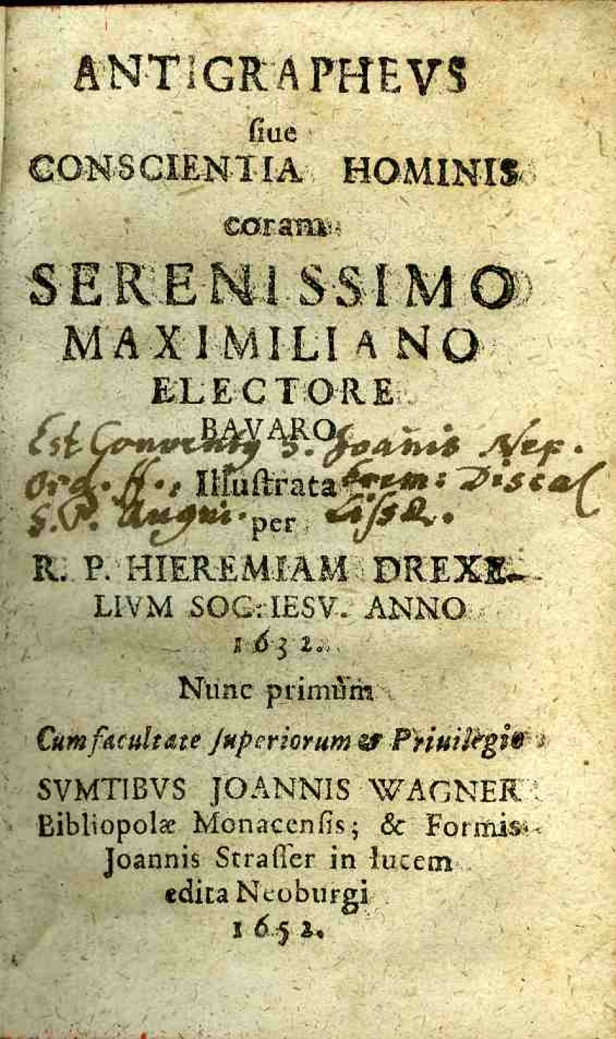 Antigrapheus siue Conscienta Hominis coram Serenissimo Maximiliano Electore Bavaro Ilustrata per R. P. Hieremiam Drexelium Soc. Iesu.