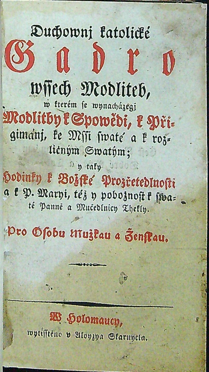 Duchownj katolické Gadro wssech Modliteb, w kterém se wynacházegj Modlitby k Spowědi, k Přigimánj, ke Mssi swaté a k rozličným Swatým; y taky Hodinky k Božské Prozřetedlnosti a k P. Maryi, též y pobožnost k swaté Panně a Mučedlnicy Thekly. Pro Osobu Mužskau a Ženskau.