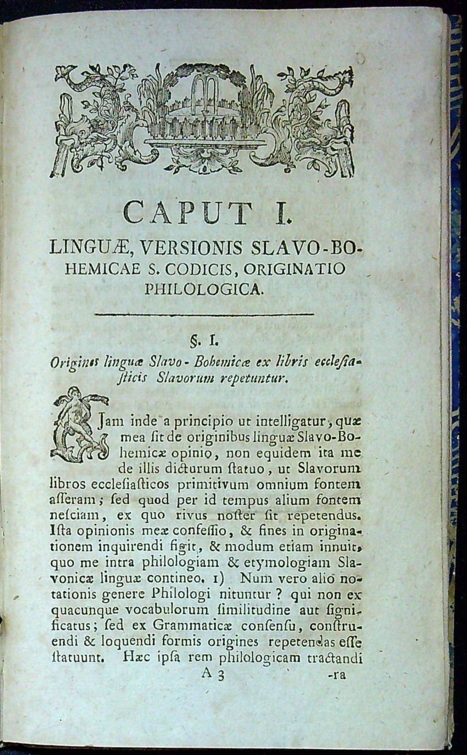 Knihopis 2146; Pumprla I,2146<br> Latinský text antikvou, místy kursivou, český kursivou, stránkové kustody, uprostřed horního okraje stran krátká dvoulinka, paragrafy, tučně tištěné versálky ve výši 2 řádků, vstupní dřevořezový vlys, na tit. straně mědiryt s postavami sv Cyrila a Metoděje držícími kostel, na str. 29 a 47drobné dřevořezové viněty, koncová ozdobná tyč. Za stranou 56 (chybně paginovanou 42) na 4 listech "POSITIONES EX VETERIS TESTAMENTI PHILOLOGIA et HERMENRUTICA SELECTAE QUAS PROPUGNABIT REL. F. CYRILLUS TAMON....", na druhém listu v záhlaví rokokový vlys s puttim držícím rozevřenou knihu, uprostřed horních okrajů stran tři drobné tiskařské ozdůbky, koncová vinětka.<br>Dobová kartonová vazba potažená mramorovaným papírem, ve hřbetu pap. pokryv z větší části chybí, desky místy odřené a zvlněné. <br>Václav Michael Durych (1735-1802), řeholním jménem Fortunát, člen paulánského řádu, profesor hebrejštiny a řečtiny na pražské universitě, několikanásobný spolurektor a provinciální vikář, zakladatel české slavistiky, blízký přítel M.A. Voigta, F.M. Pelcla a J. Dobrovského. Nabízená publikace je prvním pokusem o popis nejstarších staroslověnských rukopisů uložených ve Vatikánské knihovně, základ Durychova nejslavnějšího díla "Bibliotheca Slavica", vydaného v roce 1795.<br/> Václav Michael Durych (Ordensname Fortunat), böhmischer Paulaner und Orientalist, Professor der hebräischen und griechischen Sprache, Begründer der böhmische Slawistik. Vorliegendes Werk ist ein Versuch über die Beschreibung der ältesten altkirchenslawischen Handschriften aus der Vatikanischer Bibliothek. Im Jahre 1795 gab er sein berühmtes Werk "Bibliotheca Slavica" heraus.