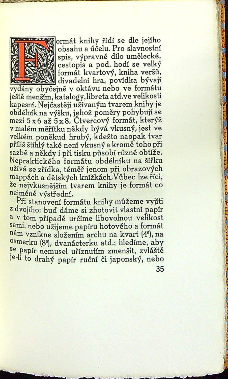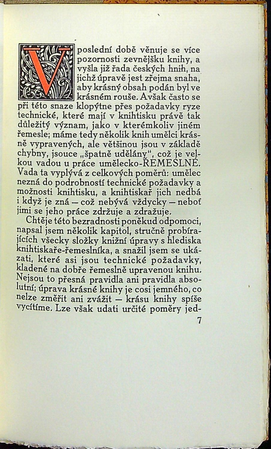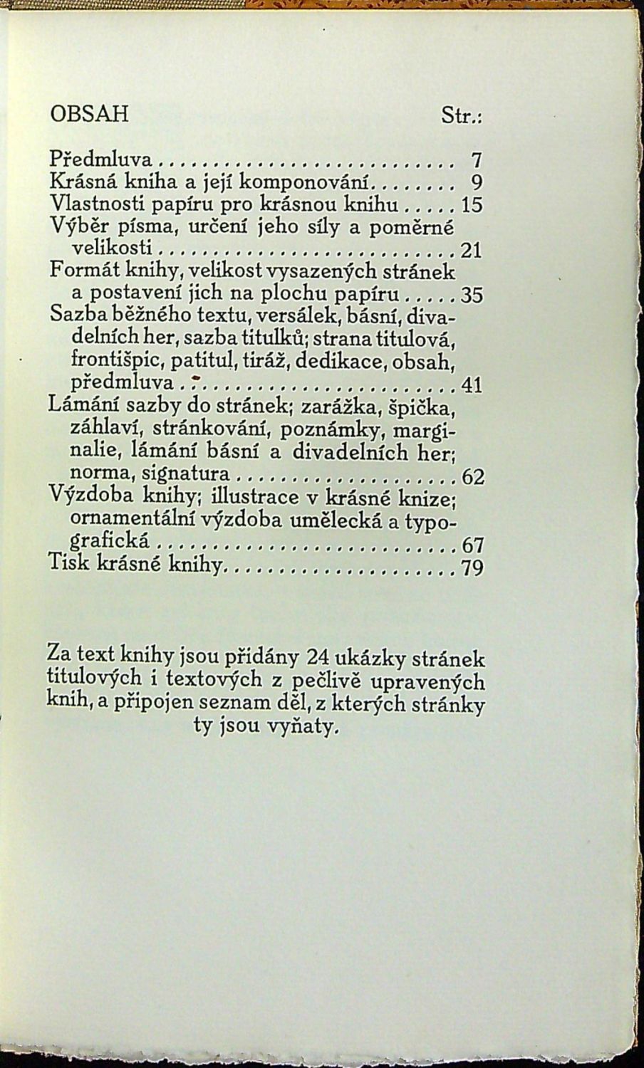 Jeden ze 400 vydaných a nečísl. výtisků, knihu upravil i vysadil Karel Dyrynk, svázal Ludvík Bradáč, kartonové desky potažené papírem s ornamentálním dekorem, plátěný hřbet a část desek při okraji se hřbetem, v horní části přes hřbet a obě dvě desky nalepen původní pap. štítek s názvem a značkou, za textem na XXIV str. římsky číslovaných ukázky typografickýc úprav titulů i stran textu. Červeno-černě tištěný titulní list, červeně tištěná tiráž, v textu plné červeně tištěné iniciály na rostlinném dřevorytovém pozadí zalomené do výše 6 řádků.<br>Vazba lehce ohmataná. Na předním přídeští, titulním listu a na zadním přídeští tužkou podpisy výtvarníka Jiřího Šalamouna z jehož knihovny kniha pochází.