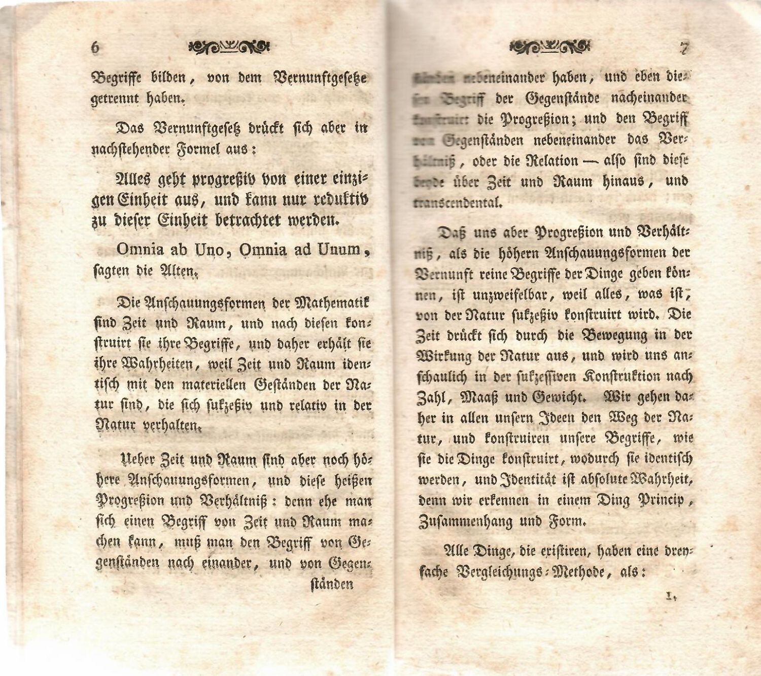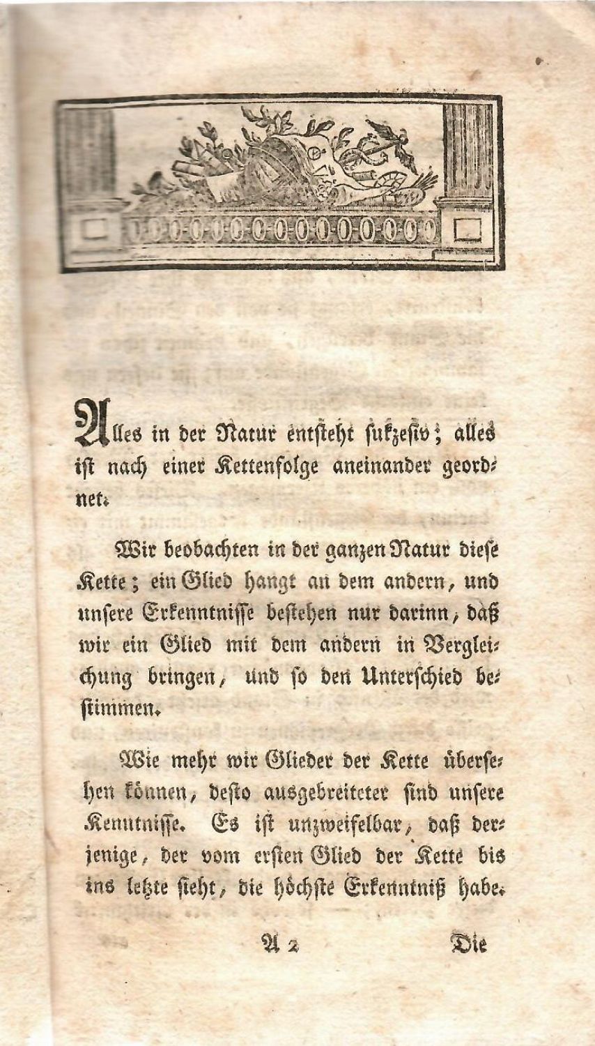 Tištěno švabachem, latinská slova antikvou, uprostřed horního okraje stran ozdůbka z ornamentů, vstupní dřevořezový vlys ve dvojitém jednoduchém rámečku s vyobrazením řady spolu nesouvisejících věcí (alegorie úvodního slova), koncová viněta.<br>Dobová obálka z modrého papíru, knižní blok šitý nití, na titulním listu razítko lipské zednářské lóže "Minerva zu den drei Palmen". Při spodním okraji hřbetu torso pap. štítku, na tit. listu perem ev. číslo.<br>Karl von Eckartshausen (28.6. 1752 Haimhausen v Bavorsku - 12.5. 1803 Mnichov), byl německý katolický mystik, filosof a spisovatel. Krátce byl členem řádu iluminátů, svými spisy ovlivnil Aleistera Crowleyho. <br>Velmi vzácné autorem anonymně vydané dílko doložené jen v několika málo evropských knihovnách.