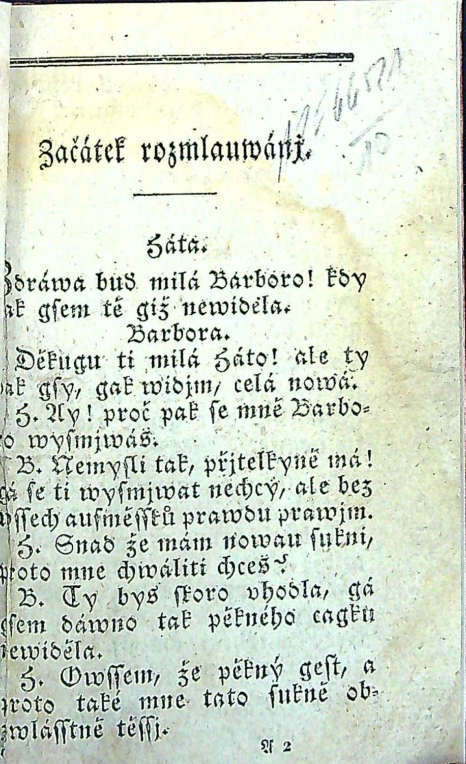 Rozmlauwánj dwauch mladých žen, w přjčině dobrého manželstwa gménem Háty a Barbory.