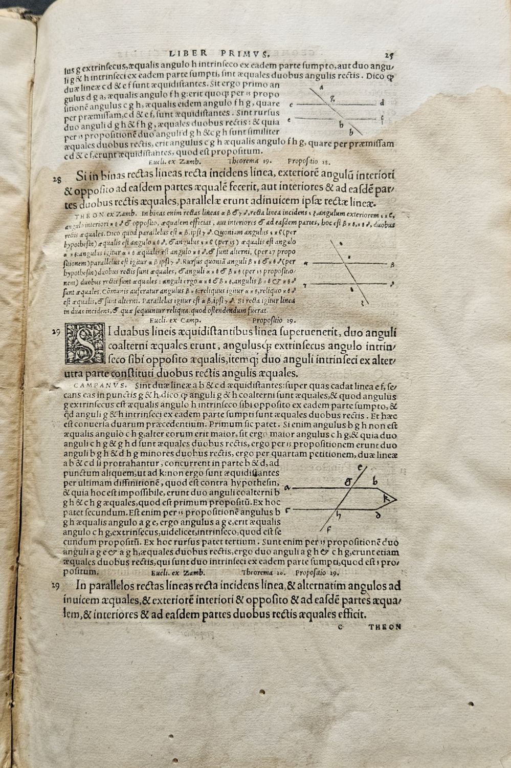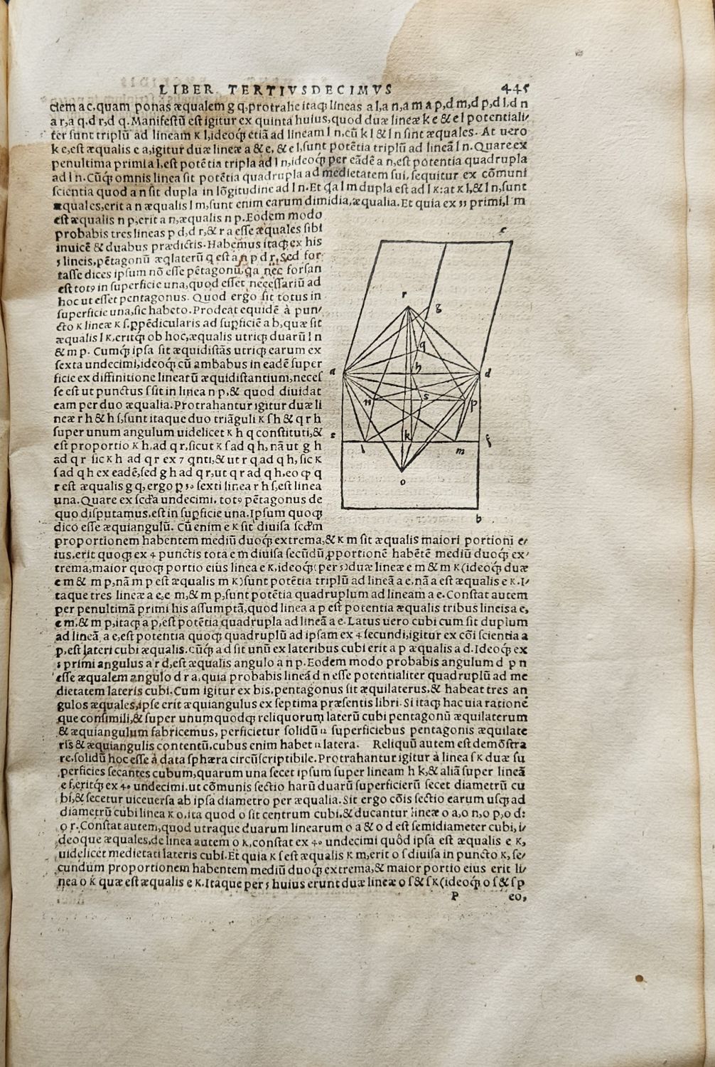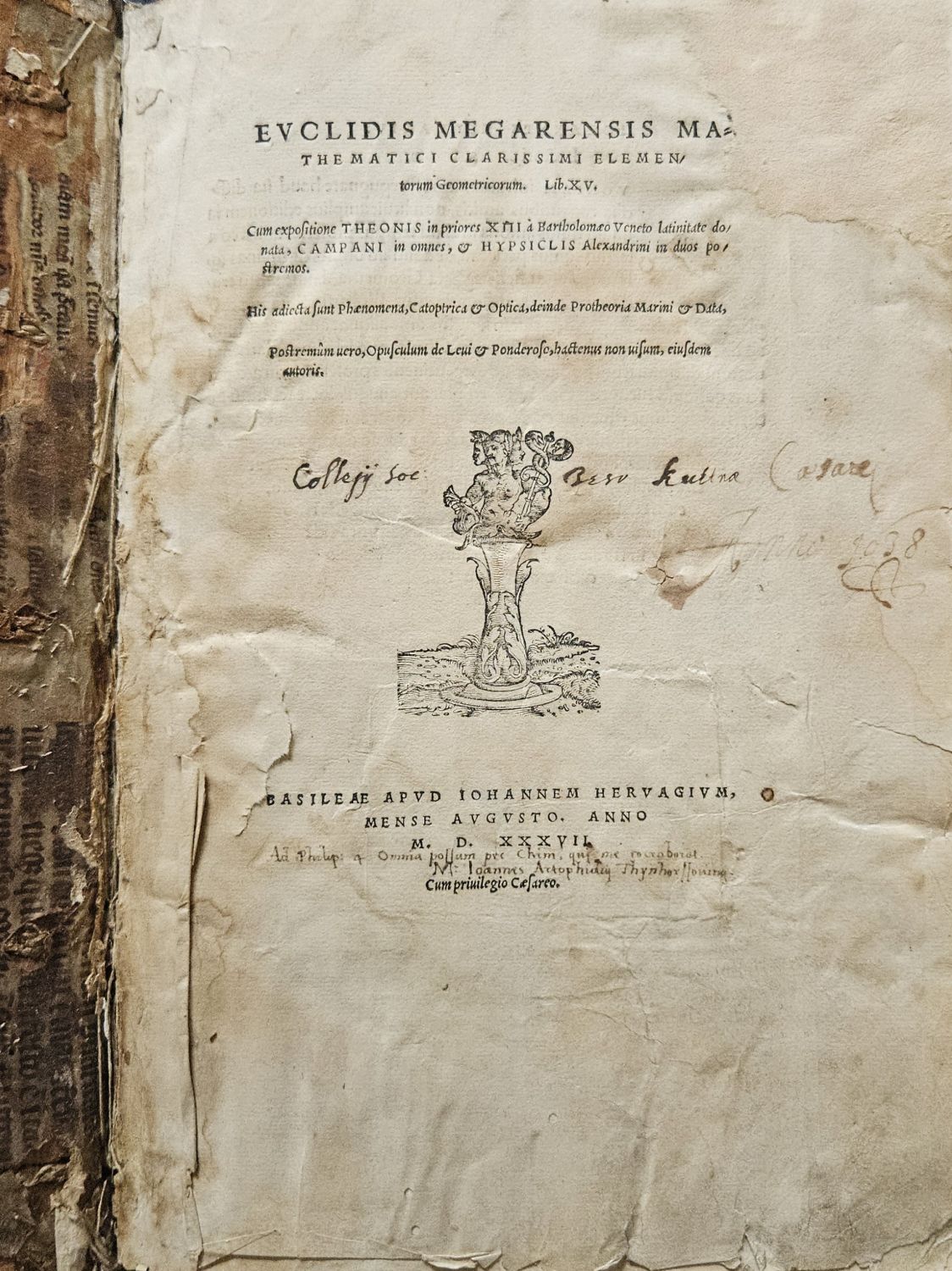 VD 16 E4154<br>Tištěno antikvou, řecká slova alfabetou, živá záhlaví, řada konturových dřevořezových iniciál na ilustrativním či ornamentálním pozadí zalomených do výše 3-11 řádků, na titulním listu viněta, vstupní pásový vlys z ornamentů. Místy chybná paginace. - Chybí l list úvodu (s předmluvou F. Melanchtona), str. 433-444, strany 579-587 a poslední nepaginovaný list. Strana 577 pomačkaná, na některých listech při spodním vnějším okraji cestičky od červotoče, papír se světlými mapami způsobenými vlhkostí.<br>+ přívazek: Vitellio "Vitellionis Mathematici Doctissimi Peri Optikes, id est de natura, ratione & proiectione radiporum, uisus, luminum, colorum at[que] formarum, quam uulgo Perspectivam uocant, libri X. habes in hoc opere, ... quum magnum numerum Geometricorum Elementorum, quae in Euclides nusquam extant, ... omnia ab hoc Autore .... diligentissime tradita, ... Nürnberg, Johann Petreius, 1535. Konturové iniciály na ilustrativním a ornamentálním pozadí zalomené do výše 4-5 řádků, živá záhlaví. V textu řada dřevorytů s geometrickými příklady a výpočty. - Chybí titulní list a folkio 2 za tit. listem, strana 37-38 proděravělá, na několika listech při horním vnějším okraji stopy od červotoče. Místy světlé mapy od vlhkosti (v menší míře než v práci prvé).<br>Bukové desky potažené pergamenem, na obou deskách tlačené zrcadlo, na přední desce dva kovové úchyty, na zadní torsa kožených spon. Pergamen. pokryv zašpiněný, místy odřený a zkrabatělý, přední deska naprasklá, na předním přídeští podél hřbetu nalepena makulatura (torso rukopisu na pergamenu z konce 14. či první půle 15. století, ve hřbetu pravděpodobně též - kousek rkp. je i na zadním přídeští). Ve hřbetu 5 vazů. Na tit. listu starý provenienční přípis datovaný 1638 "Colegii Soc. ? Kuttnae" a pod impresem "M. Ioannes ?". - (Panzer VII,484,329).