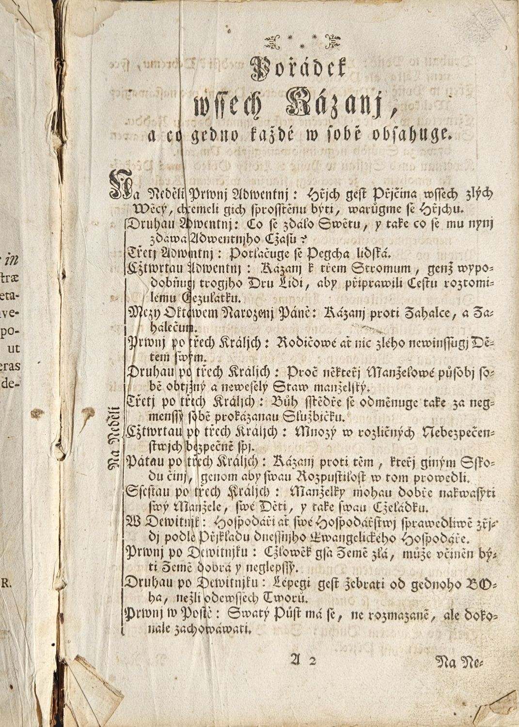 Knihopis 2414<br>Tištěno švabachem, latinský text antikvou, živá záhlaví, iniciály propletené úponky zalomené do výše 2-4 řádků, dvě úvodní ze tří stran olemované ilustrací, barokní viněty, dva vstupní vlysy, ozdobné tyče. Druhý titulní list s názvem "Mrawná Navčenj Na Wssecky Wegročnj Swátky, s přiloženými rozličnými Chwálořečmi Na obzwlásstnj Slawnosti, wydaná ....".<br> Karton. vazba z 19. století potažená mramorovaným papírem (původně kůží, na několika místech se nachází torso pův. pokryvu zdobeného slepotiskem), kožený hřbet a nárožnice. Pap. pokryv místy sedřený, při spodním okraji přední desky chybí, kůže při horním okraji hřbetu potrhaná, na přední desce spodní nárožnice chybí, na předním přídeští nalepen úřední papír z 20. století, na zadním přídeští a předsádce tragantový papír z 19. století. Titulní list první knihy zašpiněný a lehce pomačkaný, knižní blok zčásti rozvolněný. U obou knih chybí rejstříky. Druhá kniha vyšla roku 1763.