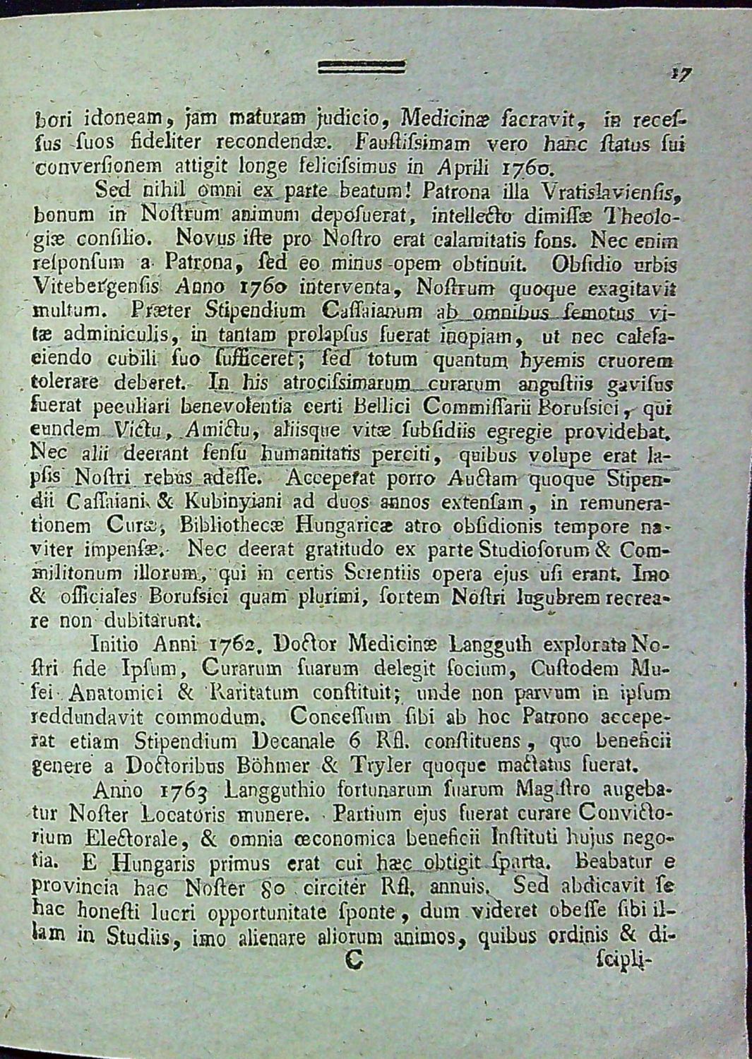 Rýzner I,383,6<br>Tištěno antikvou, signatury, stránkové kustody, arabská paginace stran při horním vnějším okraji. Na tit. listu a na konci viněty s andílkem, uprostřed horního okraje stran dvojitá mizící linka, vstupní pásový vlys s geometrickým ornamentem protkaným rostlinným věncem.<br>Dobová obálka z olejového papíru zdobeného rostlinným dekorem. Místy oslí uši.<br>Ján Feješ (2.7. 1764 Toporec - 16.3. 1823 Nižný Skálnik). Vystudoval právo na universitách ve Vídni a v Göttingenu, poté se usadil v Nižném Skalníku, kde se stal církevním inspektorem a později gemerským protonotářem. Stál u zrodu "Učené společnosti malohontské", která v letech 1808-1842 působila v oblasti Malohont (v oblasti Rimavské Soboty a od roku 1802 též v Gemeru). Ján Fejéš byl autorem řady knih náboženských, právnických, jazykovědných a historických. Publikoval v latině, němčině, maďarštině a slovenštině. - Nabízená práce je věnována vzpomínce na významného lékaře Petra Madácse (1729-1805), který působil jako hlavní lékař župy v Rimavské Sobotě a významně se zasloužil o zlepšení úrovně zdravotnictví v oblasti.