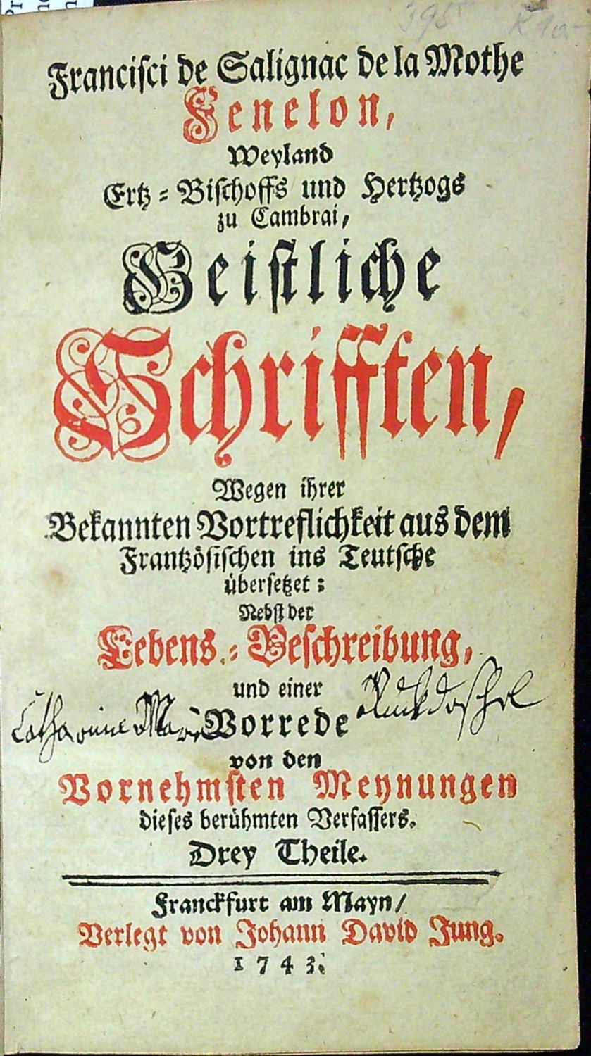 Tištěno švabachem, latinská slova antikvou, živá záhlaví od sazby oddělená jednoduchou linkou, červeno-černě tištěný titulní list prvého dílu, pásové vlysy, viněty, iniciály propletené úponky zalomené do výše 4-6 řádků, tučně tištěné plné iniciály ve výši 2 řádků, tři titulní listy (třetí pouze s názvem). Ve front. prvního dílu mědirytina s portrétem autora signovaná A. Reinhardt.<br>Dobová vazba s kartonovými deskami potaženými tragantovým papírem, pergamenový hřbet a nárožnice, barvené ořízky. Vazba zaprášená a místy odřená, pergamen ve hřbetu zkrabatělý a místy potrhaný, na tit. listu prov. záznam (nečitelné jméno) z 18. století.<br>Francois de Salignac de la Mothe-Fénelon 6.8. 1651 Sainte-Mondane - 7.1. 1715 Cambrai), byl francouzský teolog, básník a spisovatel. Od roku 1696 arcibiskupem v Cambrai, stoupenec kvietismu. Jeho nejznámějším dílem jsou "Příhody Telemachovy", které vyšly poprvé francouzsky v letech 1693-94. - Nabízené dílo obsahuje jeho duchovní spisy a ve třetím díle autorův životopis.
