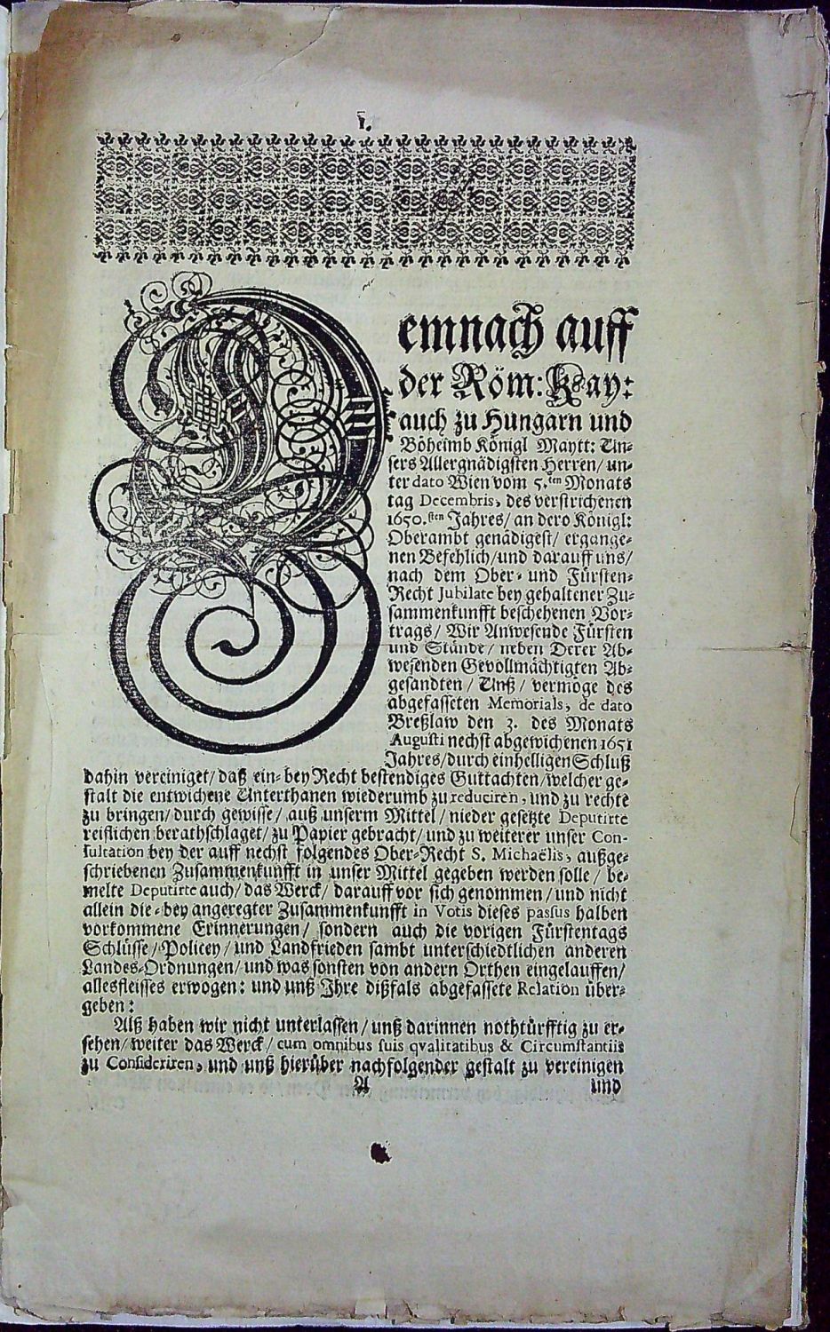 Tištěno švabachem, latinská slova antikvou, arabská paginace stran uprostřed horního okraje od sazby oddělená jednoduchou linkou, na tit. listu viněta s císařskou orlicí, v záhlaví první čísl. strany pásový vlys z drobného ornamentu, vstupní majuskulní iniciála propletená úponky zalomená do výše 21 řádků. - Titulní list při vnitřním okraji podélně podlepený v šíři cca 0,5 cm, ostatní listy podél vnitřního okraje mírně roztřepené a pří vnějším okraji uprostřed v jednom místě natržené (cca 2 cm). - Císařský výnos určený šlechtě Horního a Dolního Slezska jak se má zacházet s dopadenými uprchlými poddanými.