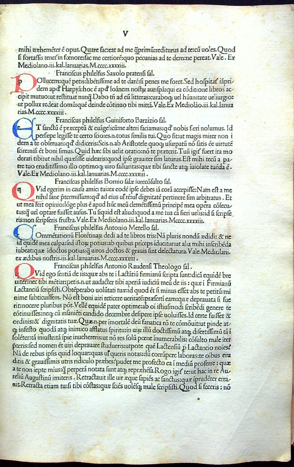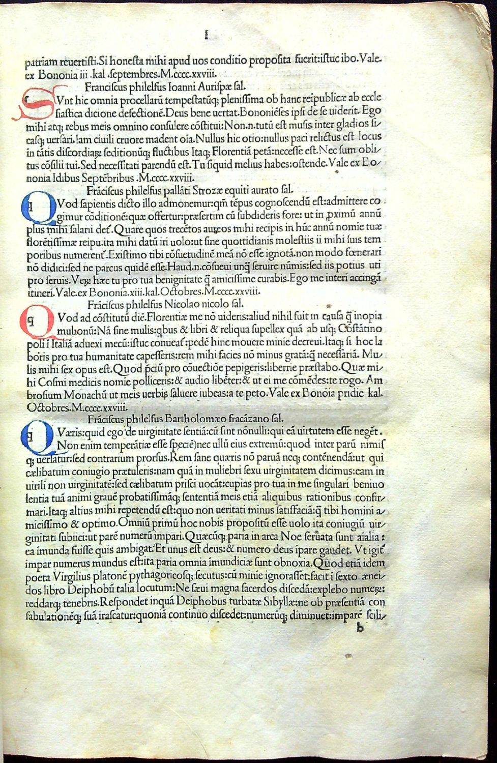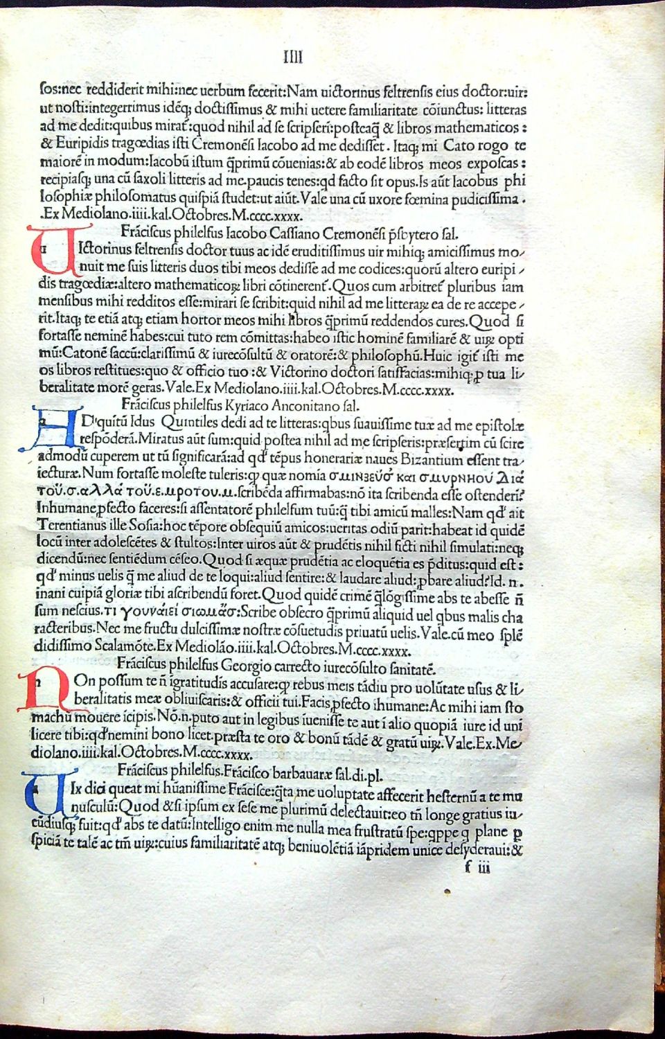 ISTC ip00584000; HC 12933; GW M32971; BMC VII,973; Goff P-584<br>Tištěno antikvou, 44 řádků, v textu řada červených a modrých kaligrafických iniciál ve výši 2-3 řádků, v úvodu jednotlivých epištol 14 červeno-modrých malovaných iniciál ve výši 6-7 řádků, vstupní červeno-zeleno-modrá malovaná iniciála ve výši 7 řádků, červeno-modrá iniciála ve výši 11 řádků na foliu 15a v úvodu 8. epištoly. Signatury, uprostřed horního okraje stran římsky vyznačené jednotlivé epištoly (I-XVI).<br>Vazba z temné hověziny z počátku 18. století (300 x 215 mm), ve hřbetu 3 vazy, ve druhém poli štítek z hnědé teletiny olemovaný zlaceným rámem se zlaceným a tlačeným názvem, červeně barvené ořízky. Na rubu posledního listu (rejstříku) rkp. přípis z konce 15. či počátku 16. století v latinském jazyce. - Chybí folio a1 (nepotištěné), folio a2 restaurované (odtržený papír při dolním okraji po text v šíři cca 60 mm dolitý), folia a7, a8 při spodním vnějším okraji restaurované (původně natržený papír scelený), folia g2 a h2 při spodním okraji lehce natržené, folio u1 s malou dírkou při horním vnitřním okraji, poslední list zčásti utržený od knižního bloku a při spodním vnějším okraji utržený kus papíru (bez ztráty textu). Na několika listech hnědé skvrnky a při spodním vnějším okraji stopy způsobené vlhkem. V první třetině knihy při spodním okraji (mimo text) malá dírka od červotoče.<br>První datované vydání, v pořadí druhé; první vydání vyšlo v Benátkách roku 1473, bez uvedení místa tisku, tiskaře a datace.<br>Francisco Filelfo (25.7. 1398 Tolentino - 31.7. 1481 Florencie), byl italský renesanční humanista. Sehrál významnou roli v oživení zájmu o klasické učení v Itálii. Vystudoval v Padově, v Benátkách se stal profesorem rétoriky. Byl jmenován sekretářem benátského konzula v Konstantinopoli, kde nashromáždil velkou sbírku řeckých dokumentů. Po návratu do Itálie se stal profesorem řečtiny a latiny ve Florencii. Díky svému vznětlivému temperamentu, kritickému psaní a zesměšňování přátel i nepřátel často měnil místa svého působiště. Roku 1475 byl pozván do Říma papežem Sixtem IV. a stal se profesorem rétoriky, po roce z Říma v důsledku neshod s papežem odešel. Filelfus je jedním z největších renesančních italských humanistů, díky své znalosti řečtiny přeložil celou řadu klasických autorů (Aristoteles, Plutarchos, Xenofón ...) do latiny a významně tak přispěl k oživení zájmu o řeckou kulturu.