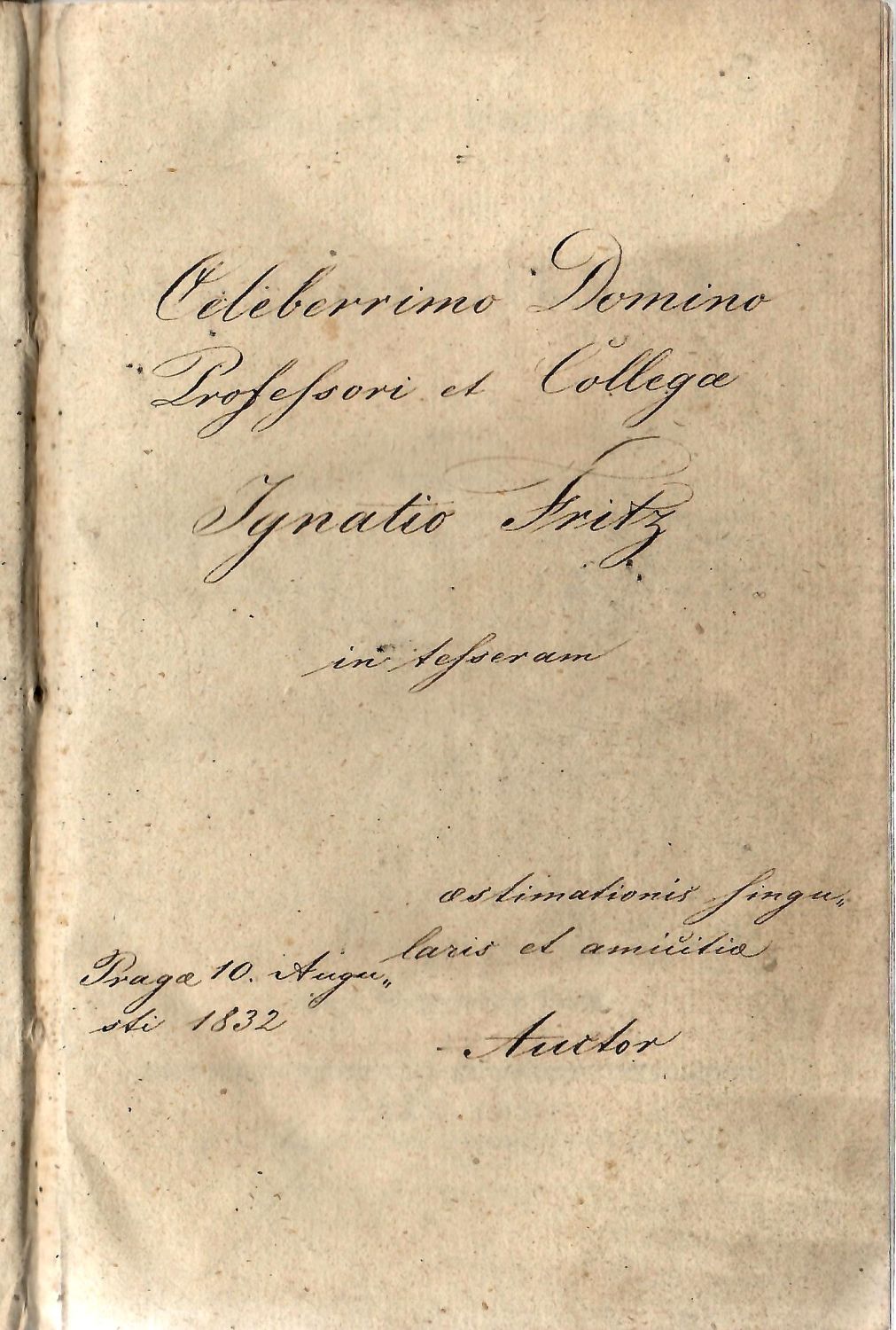 Hirsch II,373<br>Tištěno antikvou, tištěné poznámky pod čarou. Za textem 7 rozkládacích do mědi rytých tabulí.<br>Dobová kartonová vazba potažená moiré papírem, kožený hřbet a nárožnice, vazba ohmataná, moiré papír místy potrhaný a odřený, ve hřbetu tlačený a zlacený název. Papír zahnědlý, papír příloh při vnějším okraji pomačkaný. Na přední předsádce rukopisná dedikace autorova psaná perem: "Celeberrimo Domino Professori et Collegae Ignatio Fritz in Aeteram estimationis singularis et amicitia Auctor, Praga 10. Augusti 1832".<br>Johann Nepomuk Fischer (29.5. 1777 Rumburk - 17.10. 1847 Praha), byl řádným profesorem očního lékařství na pražské universitě, patřil k zakladatelům moderního očního lékařství v Čechách a v roce 1814 se stal prvním přednostou nově založeného očního ústavu v Praze.<br>Franz Ignaz Fritz (1778 Karlovac, Chorvatsko - 22.2. 1841 Praha), vystudoval lékařskou fakultu vídeňské university, od roku 1808 působil v Praze jako profesor chirurgie. Byl zakladatelem později proslulé knihovny na chirurgické klinice v Praze.