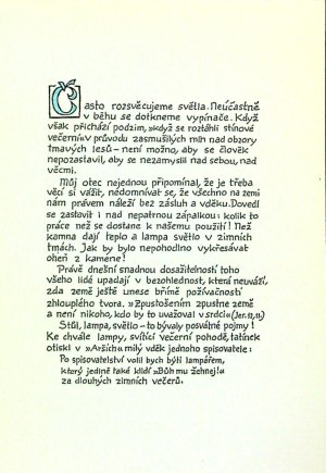 Ilustrace:Josef Florian kolorovaný linoryt ve frontispisu autorem vpravo pod deskou tužkou podepsaný, na tit. listu kolor. viněta, stejná nekolor. na přední straně obálky.