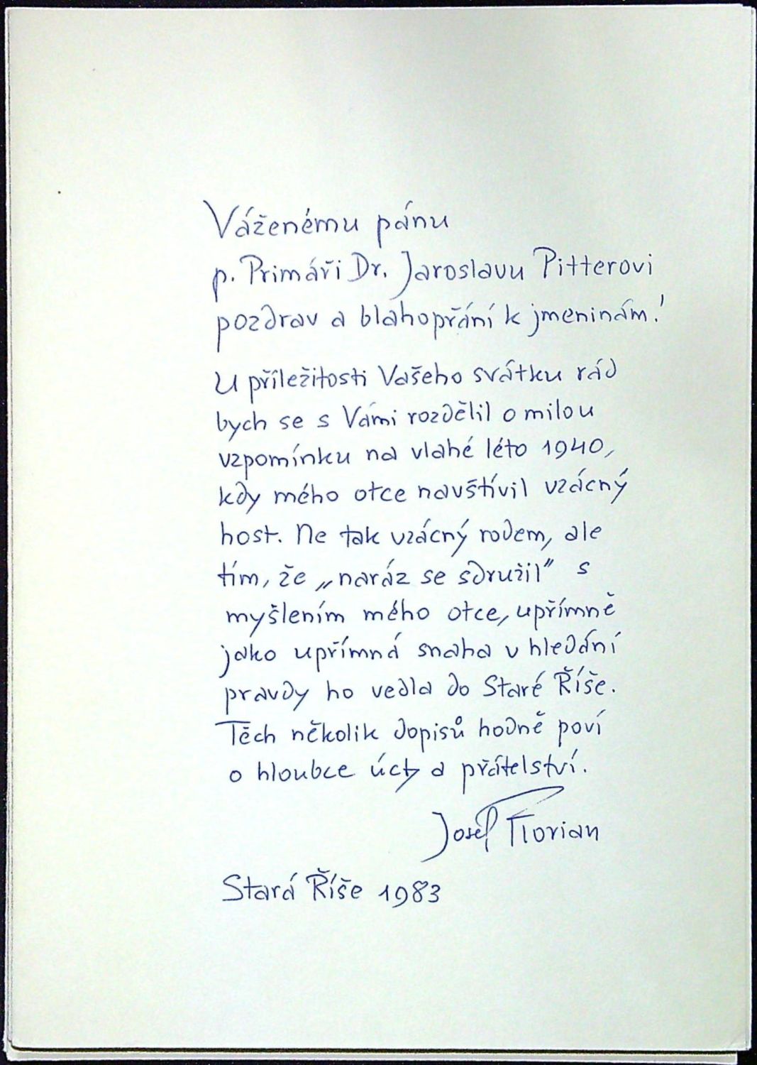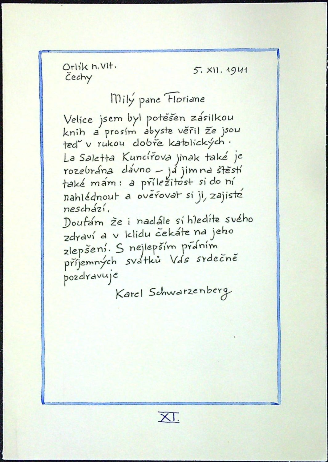 Kaligraficky psaný rukopis černým perem (přepis dopisů K. Schwarzenberga) a modrým doplňující poznámky J. Floriana. Rukopis obsahuje celkem 10 dopisů z let 1940-41. Na líci prvního listu rkp. dedikace Josefa Floriana ml. datovaná ve Staré Říši 1983 "Váženému pánu p. Primáři Dr. Jaroslavu Pitterovi pozdrav a blahopřání k jmeninám! U příležitosti Vašeho svátku rád bych se s Vámi rozdělil o milou vzpomínku na vlahé léto 1940, kdy mého otce navštívil vzácný host. Ne tak vzácný rodem, ale tím, "naráz se sdružil" s myšlením mého otce, upřímně jako upřímná snaha v hledání pravdy ho vedla do Staré Říše. Těch několik dopisů hodně poví o hloubce úcty a přátelství. Josef Florian". Na rubu dalšího listu při horním okraji uchycen fotografický portrét knížete Schwarzenberga, na lící dalšího listu červeno-černě psaný tit. list s modrým erbem, na dalších 7 římsky číslovaných listech dopisy - poslední list popsaný pouze na líci s nalepenou reprodukcí fotograf. portrétu Josefa Floriana s datem narození a úmrtí. Rukopis psaný na tuhém papíru a text na všech listech olemovaný modře nakresleným jednoduchým rámečkem. - Žlatá papírová obálka s chlopní s modře namalovaným erbem na straně přední. Přiloženo úmrtní oznámení o smrti knížete Karla z 10. dubna 1986, strojopisný opis v Čechách nepublikovaného článku Jožky Pejskara "Dr. František Schwarzenberg sedmdesátník"
