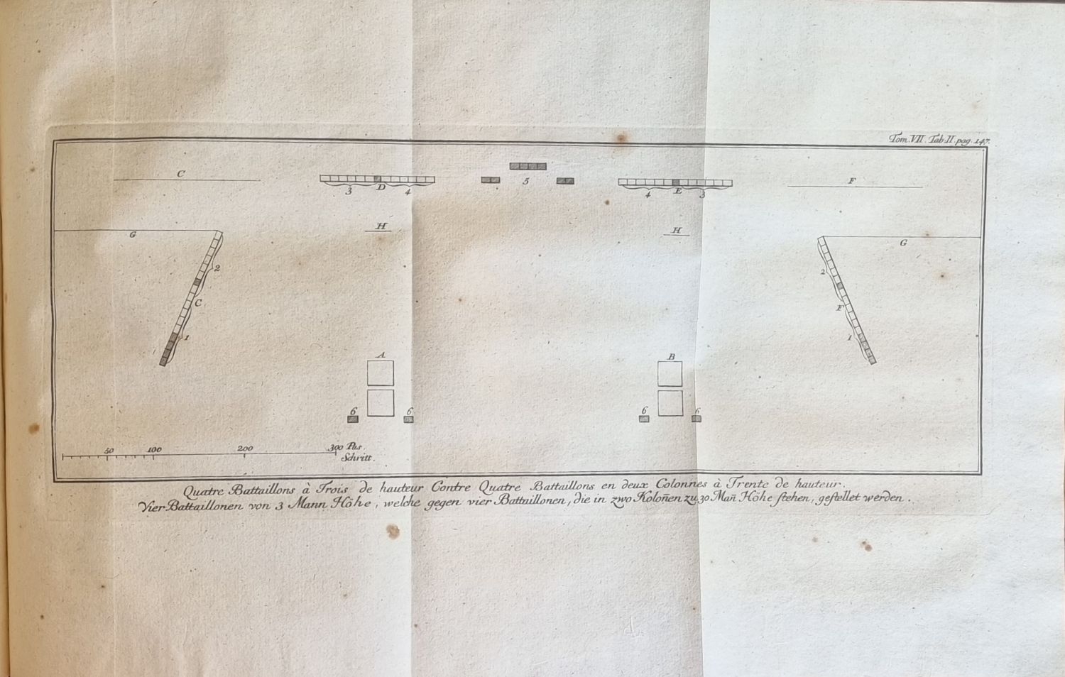 Pumprla I,3595; Holzmann-Bohatta III, 9284<br>Text tištěný švabachem, latinský antikvou, řecký alfabetou, živá záhlaví, tištěné poznámky pod čarou a po stranách, tučně tištěné iniciály ve výši 2-3 řádků, na tit. listu signet tiskaře Trattnera, vlysy, viněty, několik iniciál v rokokových ilustracích, v textu několik schematických vyobrazení. Osm mědirytinových příloh (z toho 4 rozklápěcí)s vyobrazením různých příkladů postavení vojenských jednotek a s příklady lineárních formací.<br>Dobová vazba z hnědé hověziny, ve hřbetu 5 vazů, ve druhém poli původní světle hnědý kožený štítek s tlačeným a zlaceným názvem, v ostatních polích tlačené a zlacené ornamenty, červeně barvené ořízky. Vazba ohmataná a odřená, při horním okraji hřbetu natržená, při spodním chybí kousek koženého pokryvu, zlacení vybledlé. Při horním vnitřním okraji přední desky vazby torso starého papírového štítku s číslem. Na tit. listu staré prov. razítko "Academ. bibliotheca Crem?".<br>Kniha vyšla jako dodatek (sedmý díl) k šesti dílům díla "Geschichte des Polyb", které vydal Trattner v letech 1759-1760.<br>Jean Charles de Folard (13. 2. 1669 Avignon - 25. 3. 1752 Avignon), francouzský důstojník a vojenský teoretik. Ve svých spisech rozvíjel různé taktické teorie, některé na svoji dobu velmi průlomové, jiné dosti nekonvenční či hraničící s čistou fantasií. Stál u zrodu lineární taktiky. Jeho nejznámější dílo "Dějiny Polybia" vyšlo poprvé francouzsky roku 1735 v Amsterdamu a zapůsobilo tak silně na Friedricha Velikého, že je učinil základem pro příručku svých důstojníků a lineární taktiku velmi úspěšně využil během sedmileté války. Také Napoleon jeho myšlenky efektivně zužitkoval během svých dobyvatelských tažení.