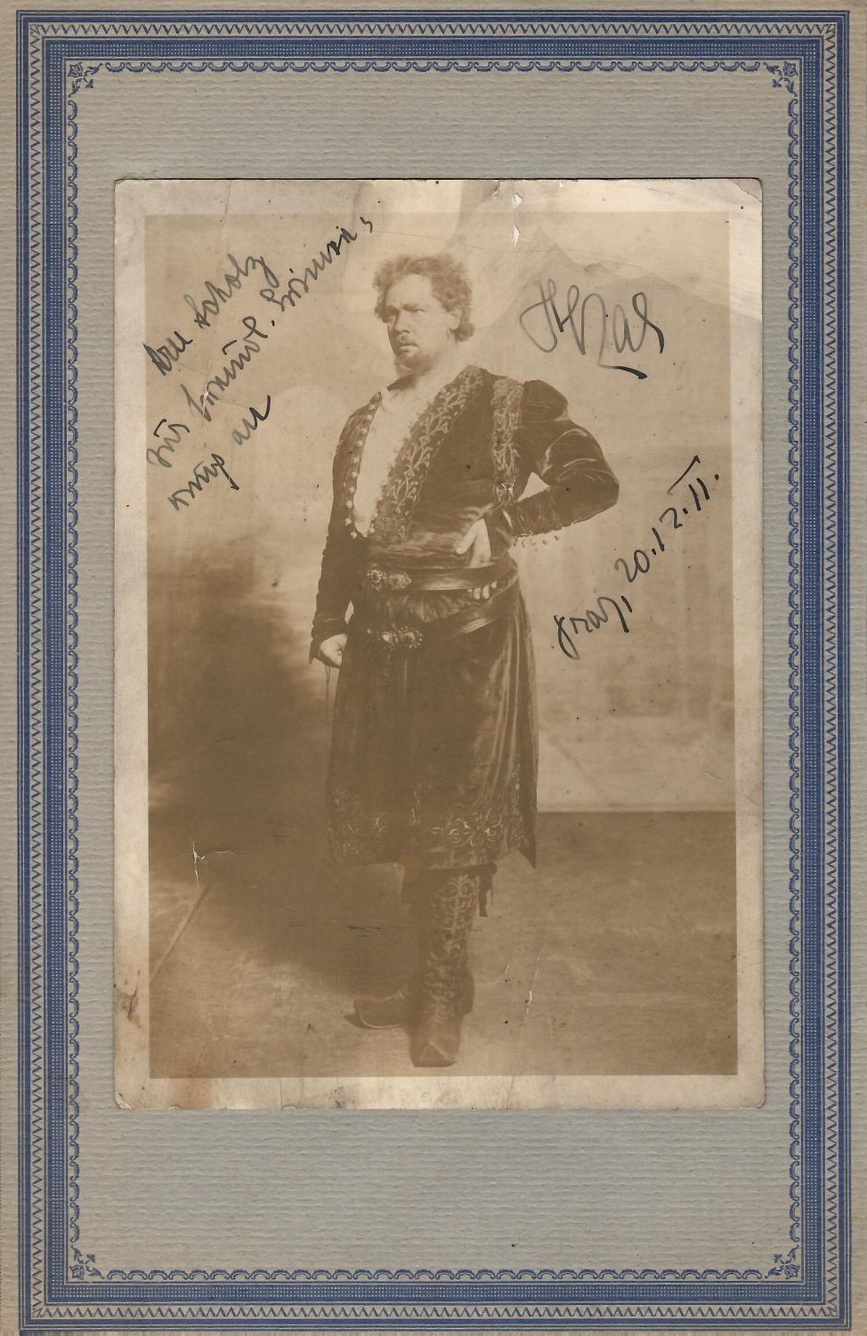 Původní fotografie (205 x 142 mm) nalepená na podkladovém papíře s tištěným ozdobným rámečkem (300 x 192 mm), vlevo nahoře Slezákova rkp. dedikace psaná německy, vpravo nahoře jeho podpis a pod ním datace "Prag, 20.12. II" (snad 1902). Fotografie zašpiněná a místy popraskaná.<br>Leo Slezak (18.8. 1873 Šumperk - 1.6. 1946 Rottach-Egern), věhlasný operní tenorista a později filmový herec. Působil ve Vídeňské státní opeře a v Metropolitní opeře v New Yorku, proslul především jako wagnerovský a verdiovský pěvec.