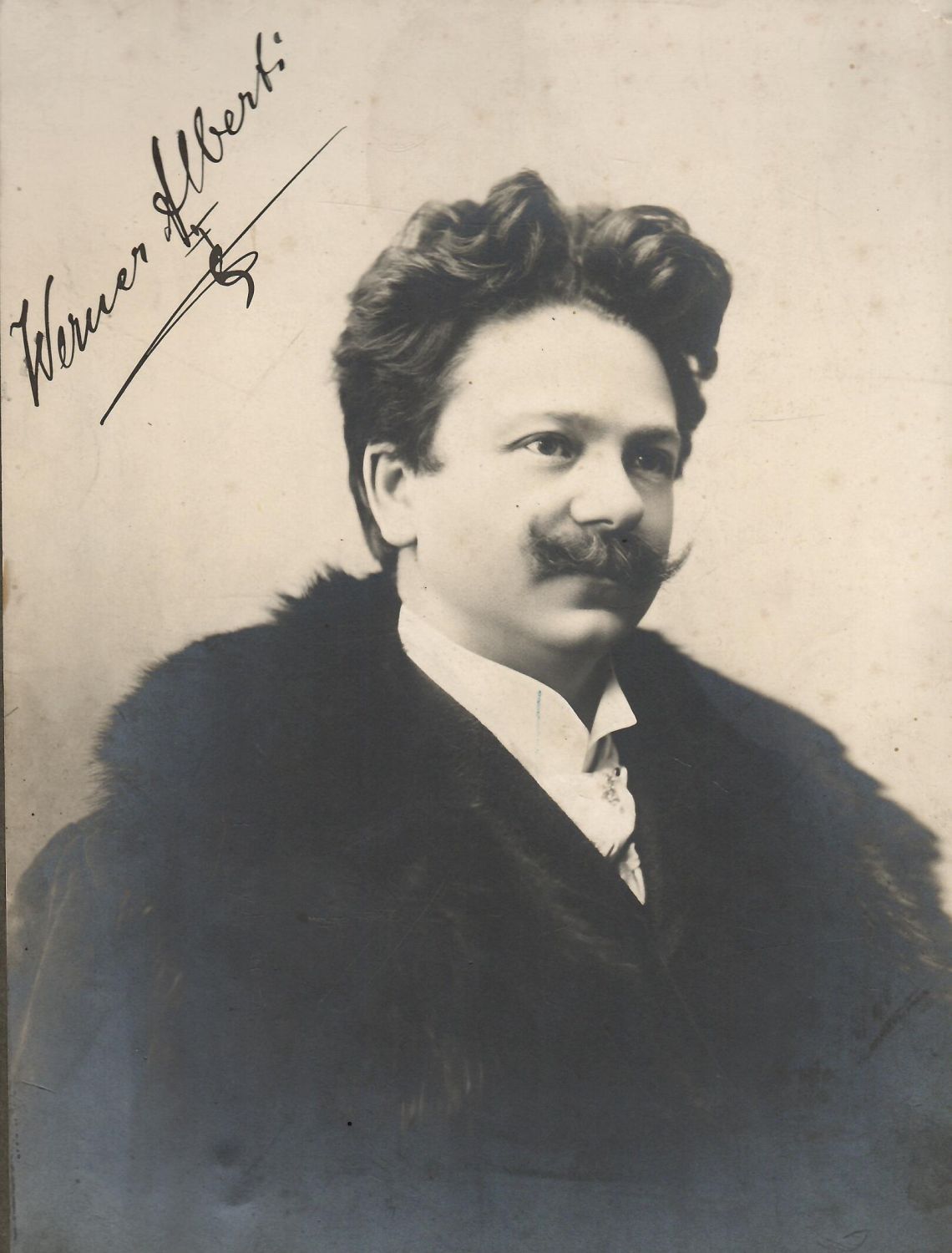 Původní fotografie (275 x 210 mm) nalepená na podkladovém kartonu (310 x 235 mm), vlevo nahoře podpis Albertriho černým perem. <br>Werner Alberti, vlastním jménem Krzywonos (21.1. 1860 Hnězdno - 29.11. 1934 Berlín), významný německý tenorista, od roku 1888 do roku 1895 působil v pražském německém divadle, později působil ve všech předních operních scénách.