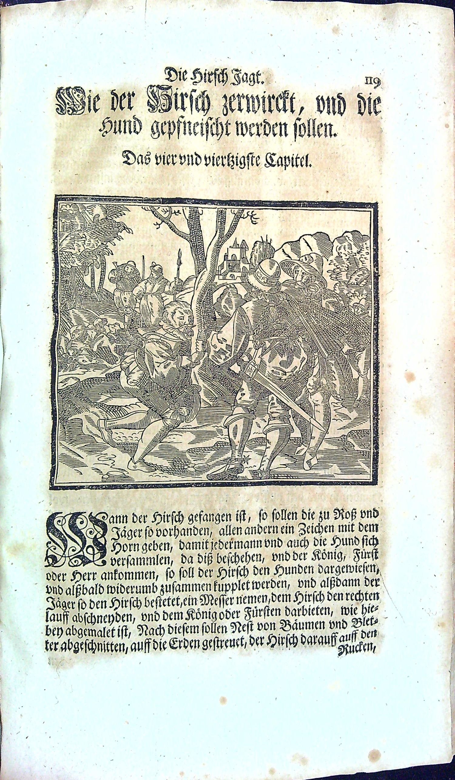 Neu Jägerbuch: Jacoben von Fouilloux, einer fürnehmen Adelsperson in Franckreich aus Gastine in Poitou. Darinn gründlich beschrieben und zu finden, Vom Jäger, der Jagten anfang, des Jägers Horn und Stimm, wie er sich deren auff der Jagt, recht gebrauchen, und artige Hifft Blasen soll, und was zu jedem sonst besonderes mehr erfordert wird. Auch von Laid, Jag, Hetz und allerley Hunden, ihrer art und herko[m]men, Welcher gestalt und zeit, sie zubelegen, Welffen sollen, von der Wuot, Raud und andern zufällen, zu retten, und zuverwaren, wie sie auff allerhand Wildpreth, und zum Horn, anzubringen, zu arbeiten, mit hoher verrer Nasen verfahen, die fährt einfallen, beharren, verfallen, und auff der Jagt fürzulegen, zu Passen, zupfneyschen, etc. Item von der Hirsch, Schweins, Hasen, Fuchs und Dachs Jagt, das ist von .....,.