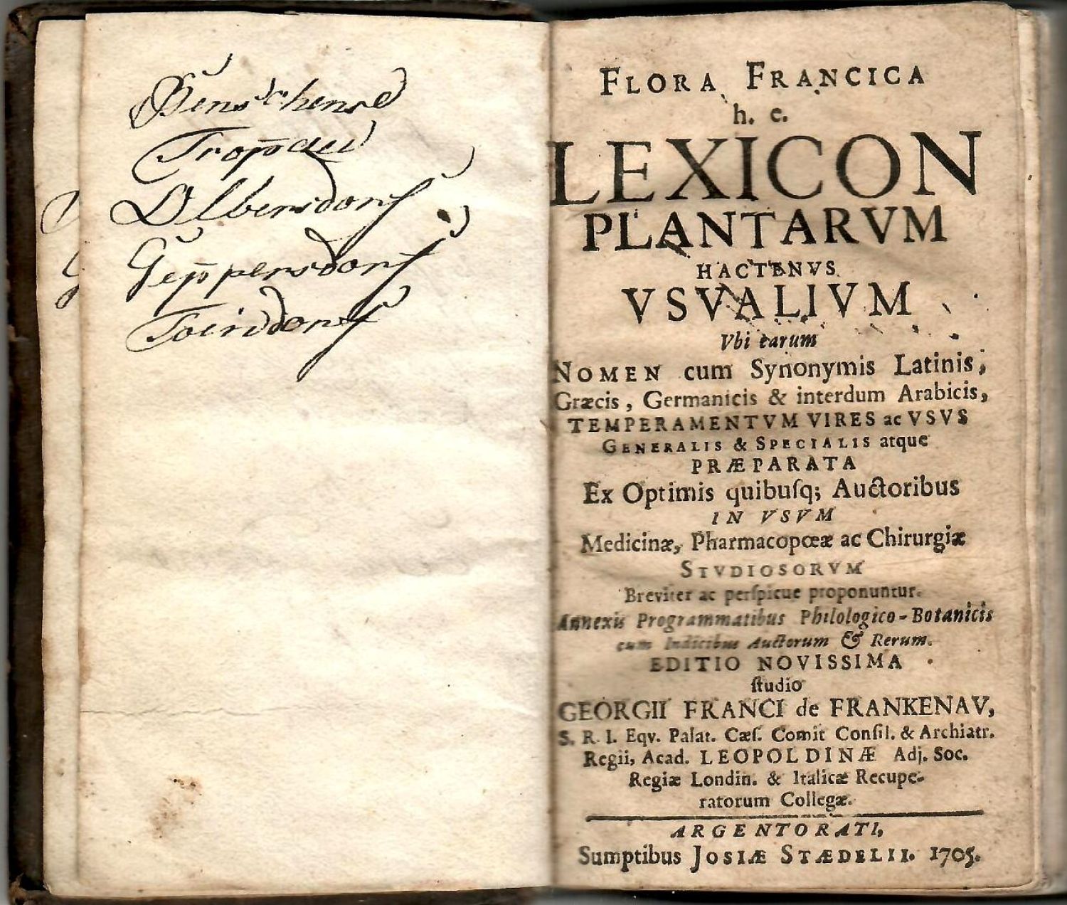 FLORA FRANCICA h. c. LEXICON PLANTARVM HACTENVS VSVALIVM Vbi earum NOMEN cum Synonimis Latinis, Graecis, Germanicis & interdum Arabicis, TEMPERAMENTVM VIRES ac VSVS GENERALIS & SPECIALIS atque PRAEPARATA Ex Optimis quibusq; Auctoribus IN VSVM Medicinae, Pharmacopoae ac Chirurgiae STUDIOSORVM Breviter ac perspicue proponuntur. Annexis Programmatibus Philologico-Botanicis cum Indicibus Auctorum et Rerum.