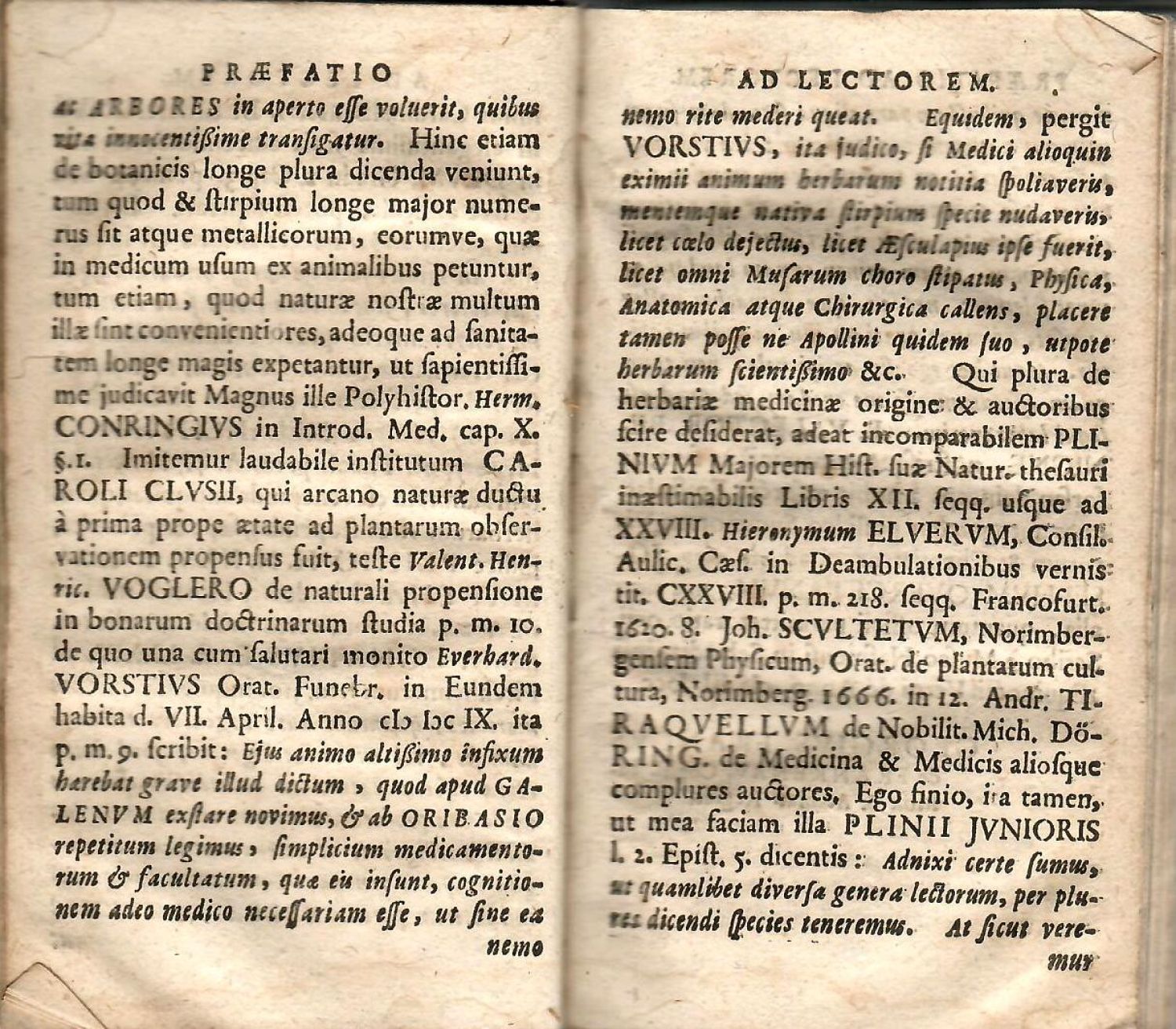 Konturové iniciály na rostlinném pozadí ve výši 5-8 řádků, vlysy z rostlinných ornamentů, tučně tištěné versálky. Za stranou 240 mezititul druhé samostatně paginované části "SEQVUNTUR PROGRAMMATA BOTANICA, ...". - Dobová vazba z tmavé hověziny, ve hřbetu 4 vazy, ve druhém poli dobový kožený štítek, v ostatních polích tlačený a zlacený ornament, na předsádkách dobový tragantový papír. Vazba silně odřená, první pole hřbetu proděravělé od červotoče, zlacení hřbet. štítku sedřené, na předních palistech staré poznámky černým inkoustem, zadní předsádka chybí; místy slabé hnědé skvrnky.<br>Georg Frank von Frankenau (1644 Naumburg - 1704 Kodaň), německý lékař a botanik. Ve Štrasburgu vystudoval medicínu a anatomii a r. 1666 získal doktorát, 1671 získal profesuru na universitě v Heidelbergu, 1693 se stal členem Royal Society. Posledním jeho působištěm byl kodaňský dvůr Kristiána V.